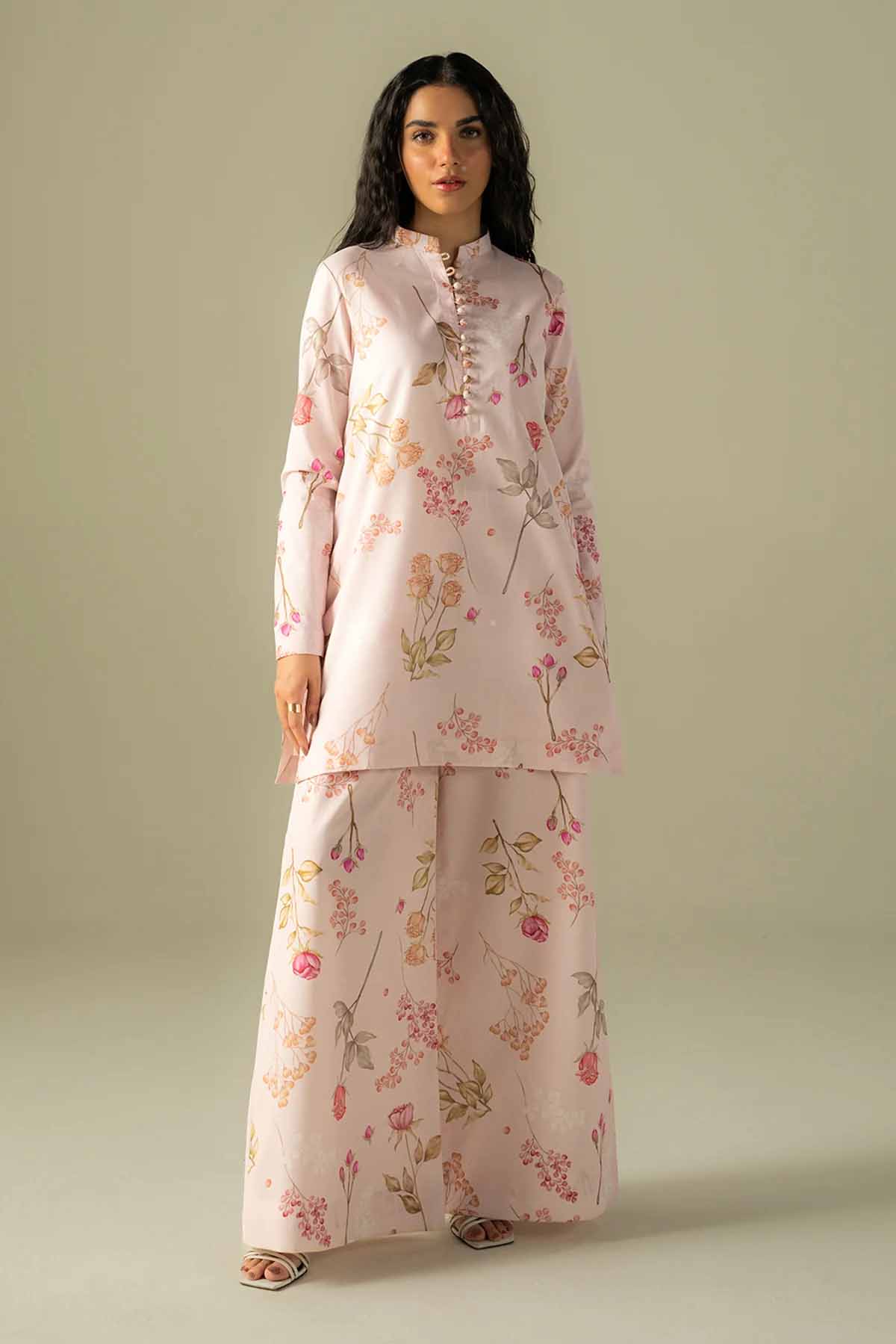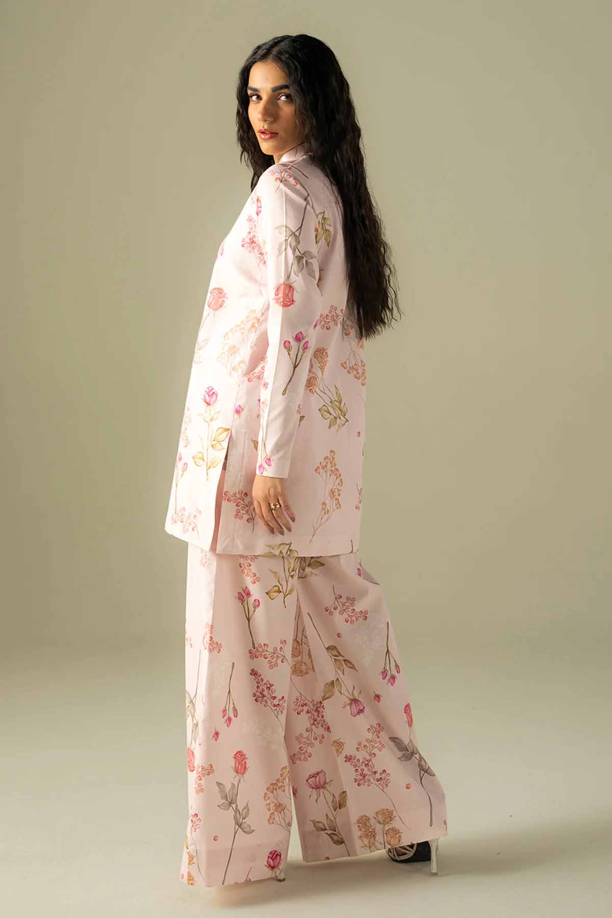 • A blush pink co-ord set adorned with soft floral prints, blending elegance with ease. Features a straight-cut shirt with neckline and flowy wide-leg trouser. for a breezy silhouette.