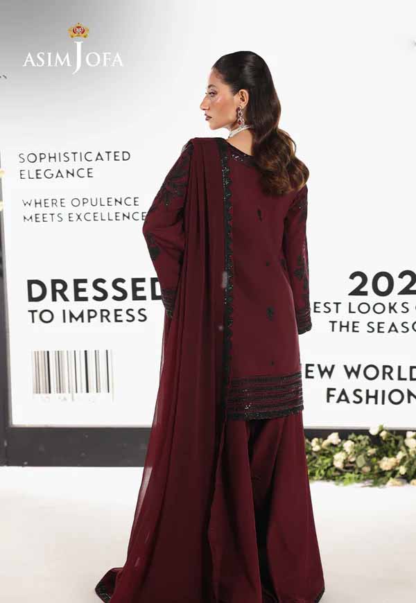 • Effortlessly poised, this maroon ensemble channels understated allure with a contemporary twist. The shirt features sleek black threadwork accentuated by tonal black sequins, adding a soft shimmer and rich texture against the deep maroon base—a harmony of contrast and restraint. Paired with a flowy chiffon dupatta and matching trousers, the look is minimal yet magnetic, designed for moments where simplicity speaks volumes.