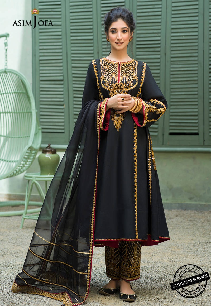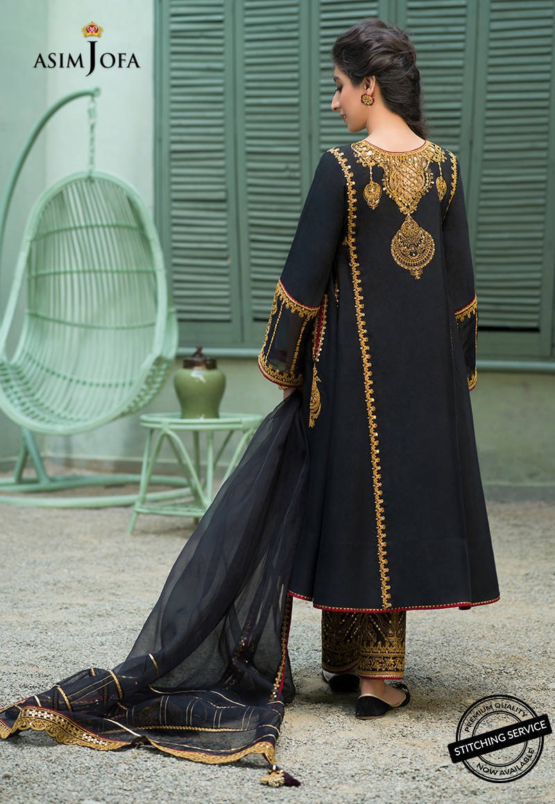 • Donning this traditional black number Mariam Nafees gives off tribal vibes. The kurta is fashioned into flared kalidaar cut with pockets and heavily embroidered front and back neckline made in golden dori and sequins. Loose trouser hem is also decorated with heavy border. The dupatta is solid dyed with embroidered edging on black organza bordering on all four sides.
