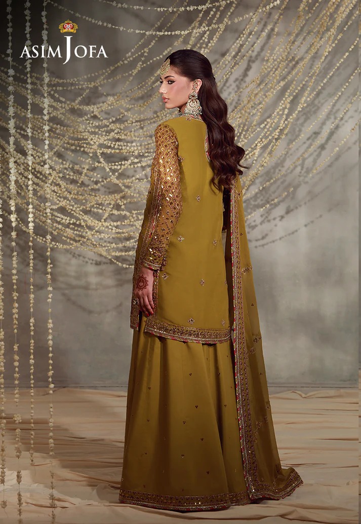 • This mehndi green ensemble captures the first whisper of festivity carried through the air of celebration. The front-open shirt unfolds like a regal tapestry, where light gold zari and sequins shimmer softly against a rich interplay of maroon and green threadwork. The embellishment glows with refined brilliance—striking a perfect balance between opulence and restraint, creating a rhythmic play of light across the fabric. Paired with chann embroidered trousers, subtly sparkling and framed by an elegant border, and finished with a beautifully embroidered dupatta, the look comes together as a composition that feels both vibrant and timeless.