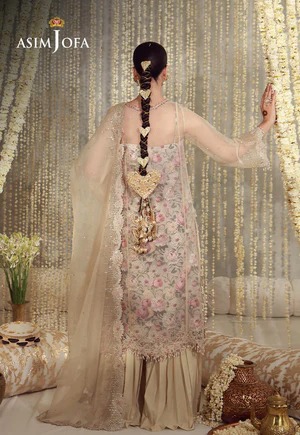 • Layers of artistry revealed beneath sheer elegance, this beige ensemble is a study in thoughtful design. The organza shirt carries delicate embroidery in light gold zari and cupped sequins, enriched with hues of green, pink, and beige threadwork that create a soft yet dimensional effect. Beneath it, a printed silk lining emerges subtly, adding depth and an unexpected richness to the composition. Paired with a beautifully embroidered dupatta finished with scalloped edges, the ensemble feels like a carefully composed masterpiece, each element enhancing the next.