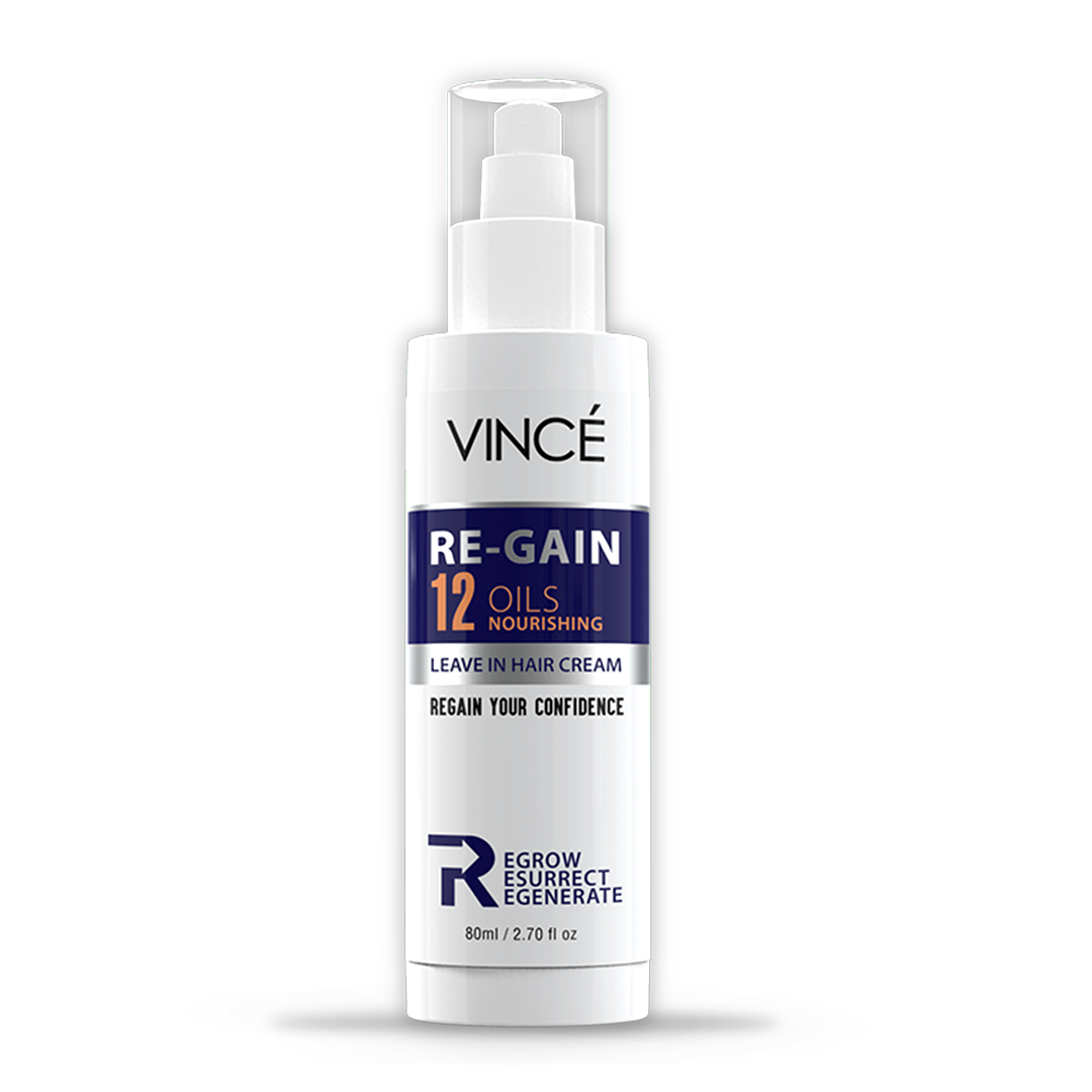 • Vince Regain Leave in cream is exclusive blend of 12 nourishing oils that work synergistically to promote hair growth, make hair follicle nourishing and active, and also suppress hair become greasy. A gentle everyday Leave In cream enriched with Onion oil, Tea Tree oil, pumpkin seed oil, Egg oil Jojoba oil, Argan oil, Sweet Almond Oil, Coconut oil, Black sesame oil, gooseberry oil (Amla) soapnut Oil and Cyperiol Oil (Nagarmotha) which help to regrowth of hairs by activating dormant hair follicle tissues on the scalp also nourishes the scalp and strengthens hair strands to encourage fresh growth. It helps to penetrate hair follicles for all-day moisture without greasy feel also keeps hair, resilient, smooth and shiny. . Works for both men and women equally.