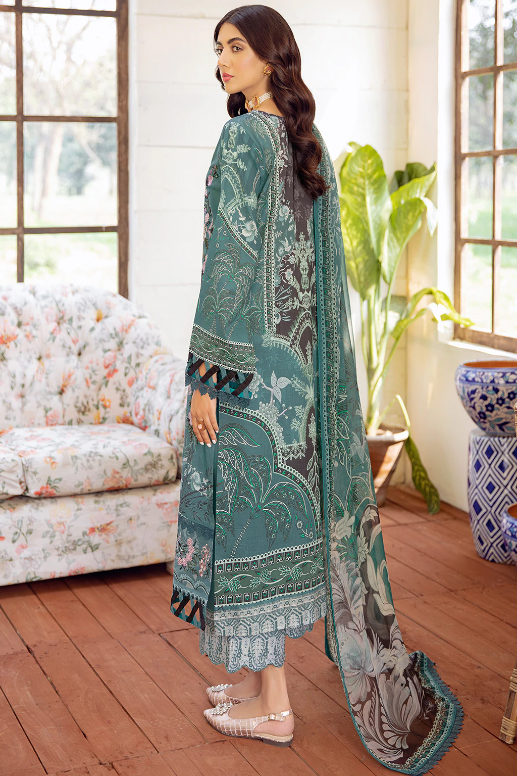 • Digital printed shirt 3 meter Embroidered front Embroidered lace for daman Digital printed chiffon dupatta 2.5 meter Dyed trouser 2.5 meter