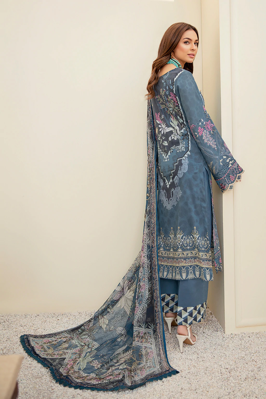 • Digital printed shirt 3 meter Embroidered front Embroidered lace for daman Digital printed chiffon dupatta 2.5 meter Dyed trouser 2.5 meter