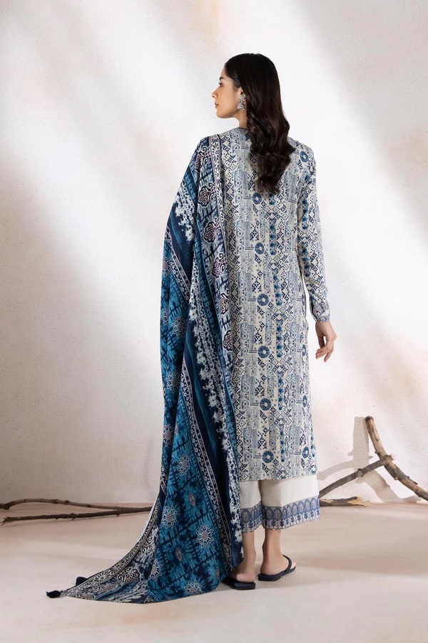 • Elevate your look with this beige hued printed embroidered three piece linen ensemble featuring printed blue dupatta.