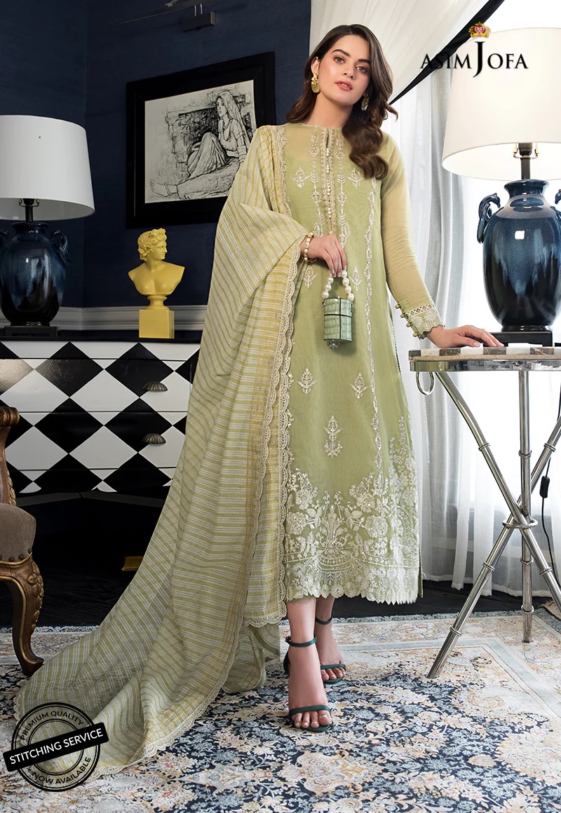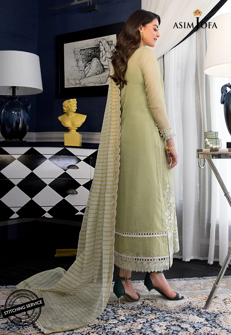 • This soft pale green ensemble resonates so well with Minal Khan’s mellow personality. A gauzy cotton net organza base is embroidered meticulously with ivory thread and. Glinting silver sequins. A heavy daaman border and khaddi woven stripped dupatta takes this design to another level. It also features a dyed cotton silk straight pant.