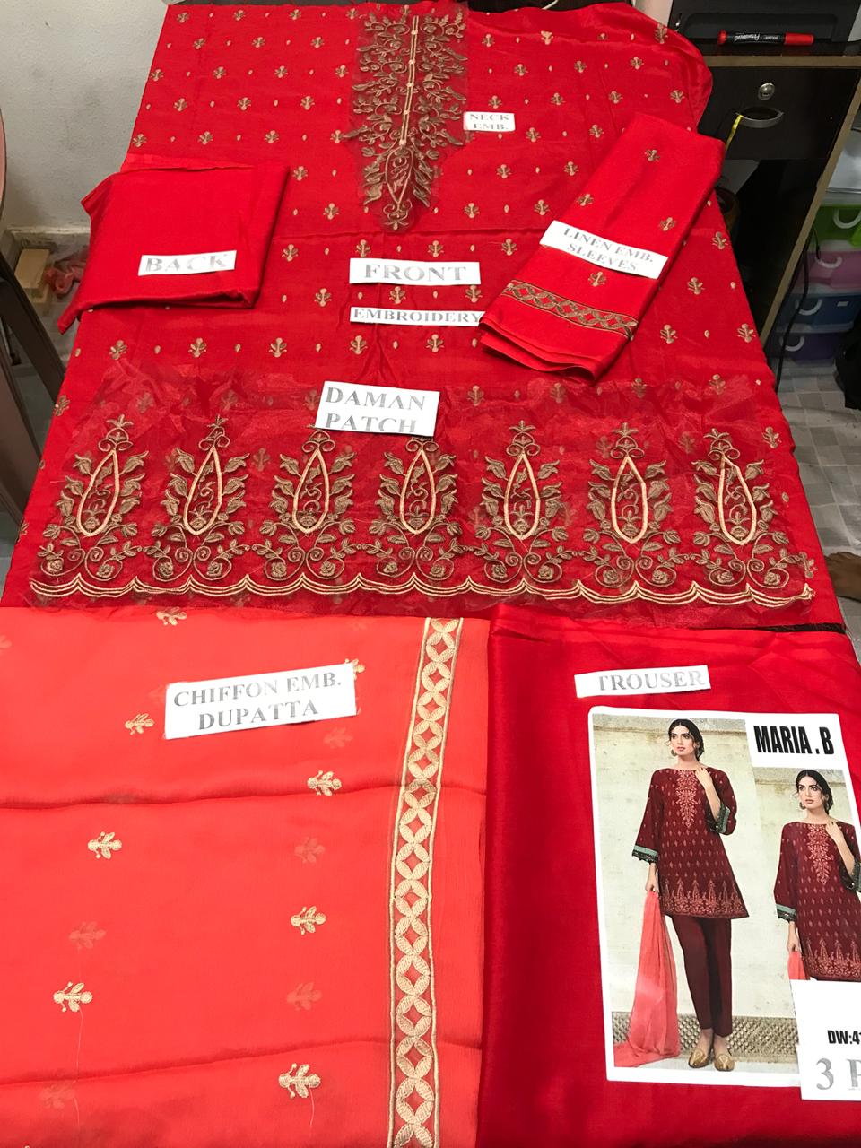 • Embroidered Linen Fabric Shirt , Linen Trouser , With Chiffon emb. Dupatta