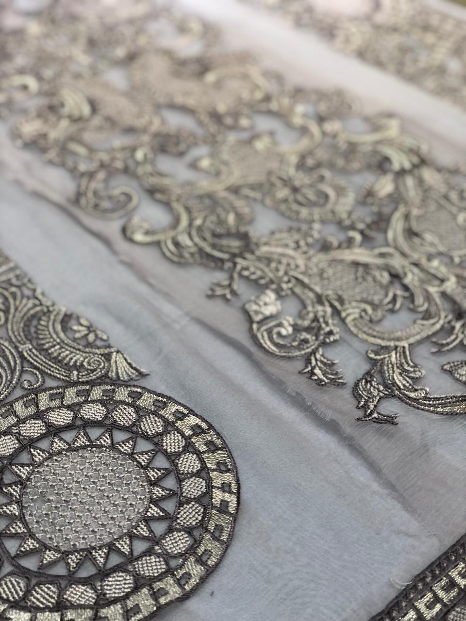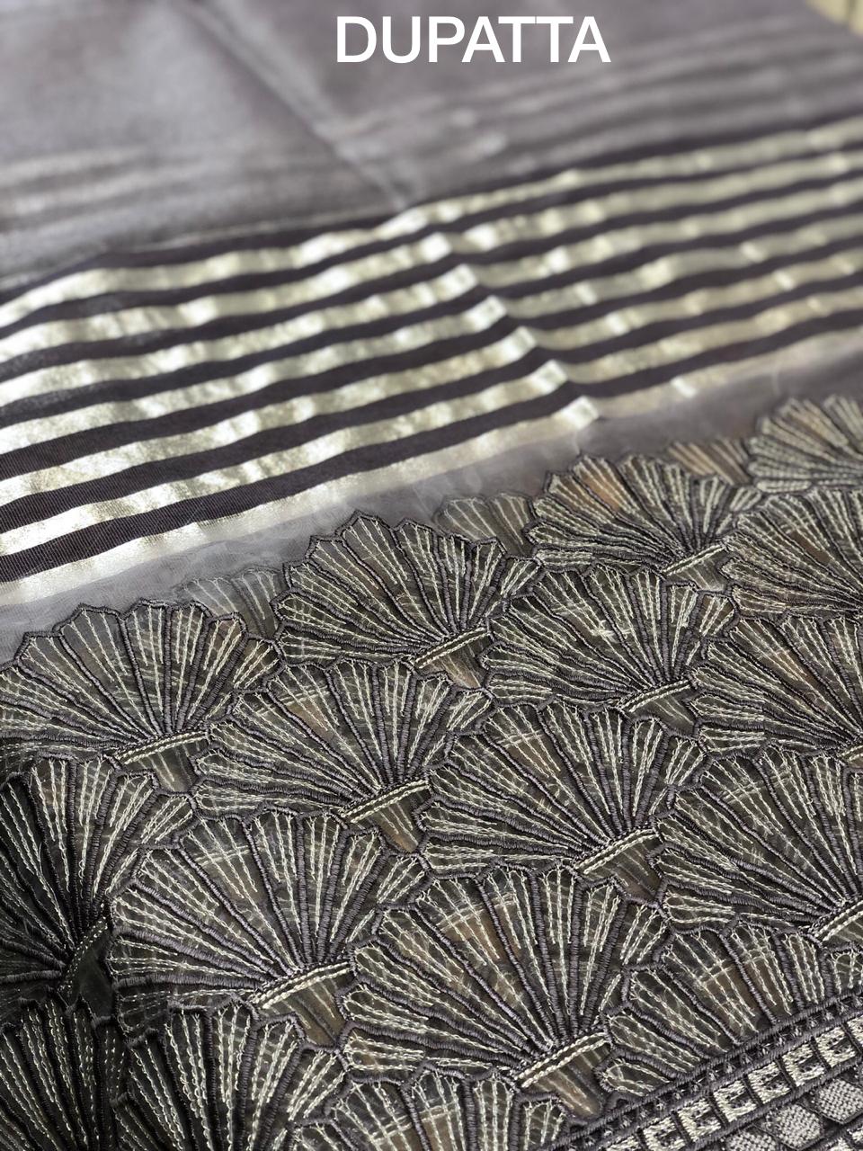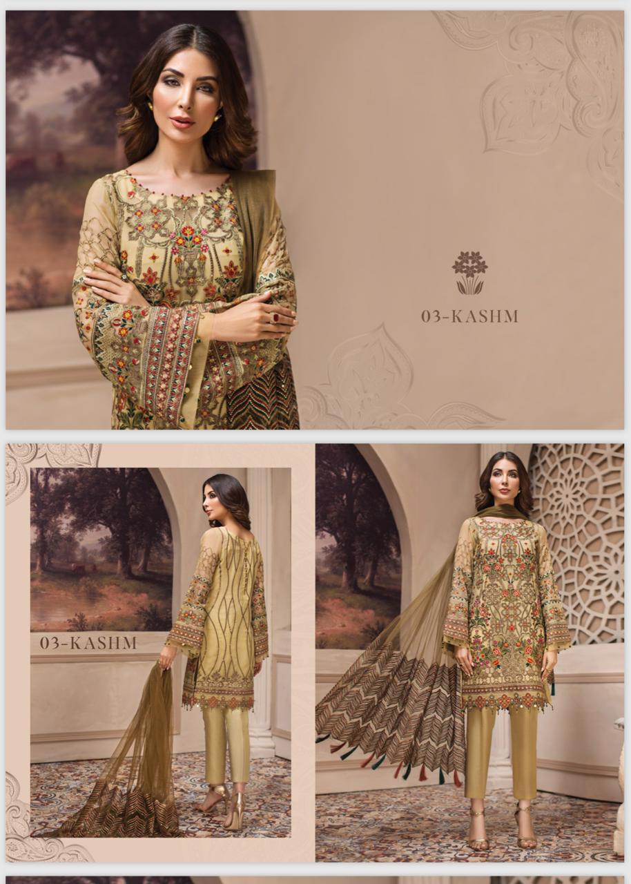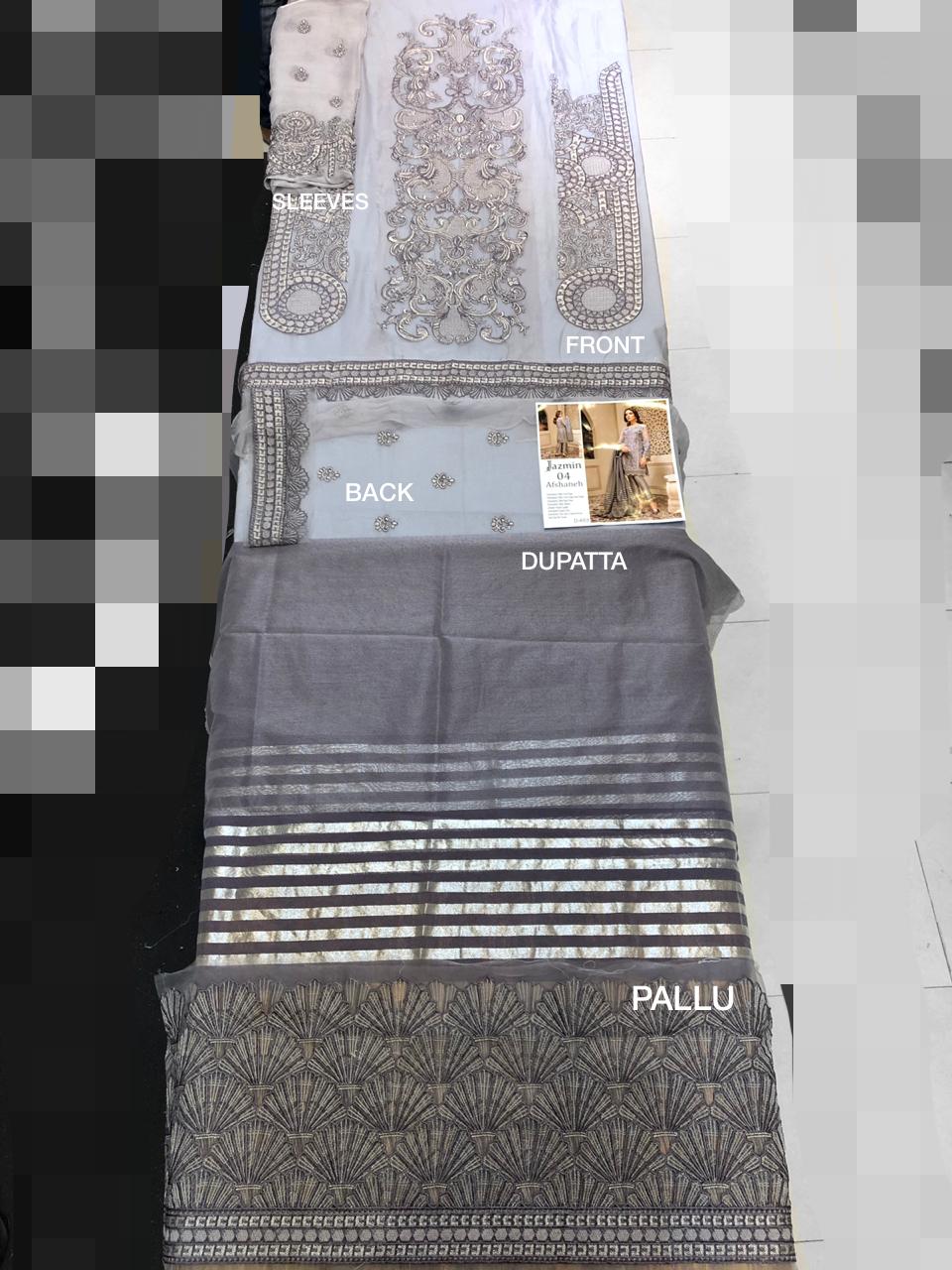 • JAZMIN LATEST LUXURY CHIFFON COLLECTION HEAVY EMBROIDERED DRESS ON CHIFFON WITH THREAD AND METTALIC YARN (TILLA) WORK. EMBROIDERED CHIFFON FRONT CENTRE PANEL. 2 EMBROIDERED CHIFFON SIDE PANELS. EMBROIDERED FRONT DAMAN LACE ON TISSUE. EMBROIDERED BACK CENTRE PANEL. 2 EMBROIDERED BACK SIDE PANELS. EMBROIDERED BACK DAMAN LACE ON TISSUE. EMBROIDERED SLEEVES ON CHIFFON. COTTON MESSURI JACQUARD SHAWL WITH 2 EMBROIDERED ORGANZA DUPATA PALLUS