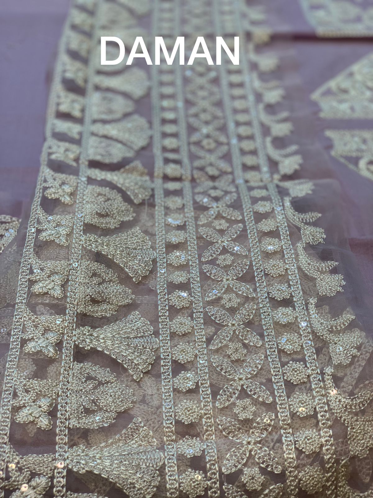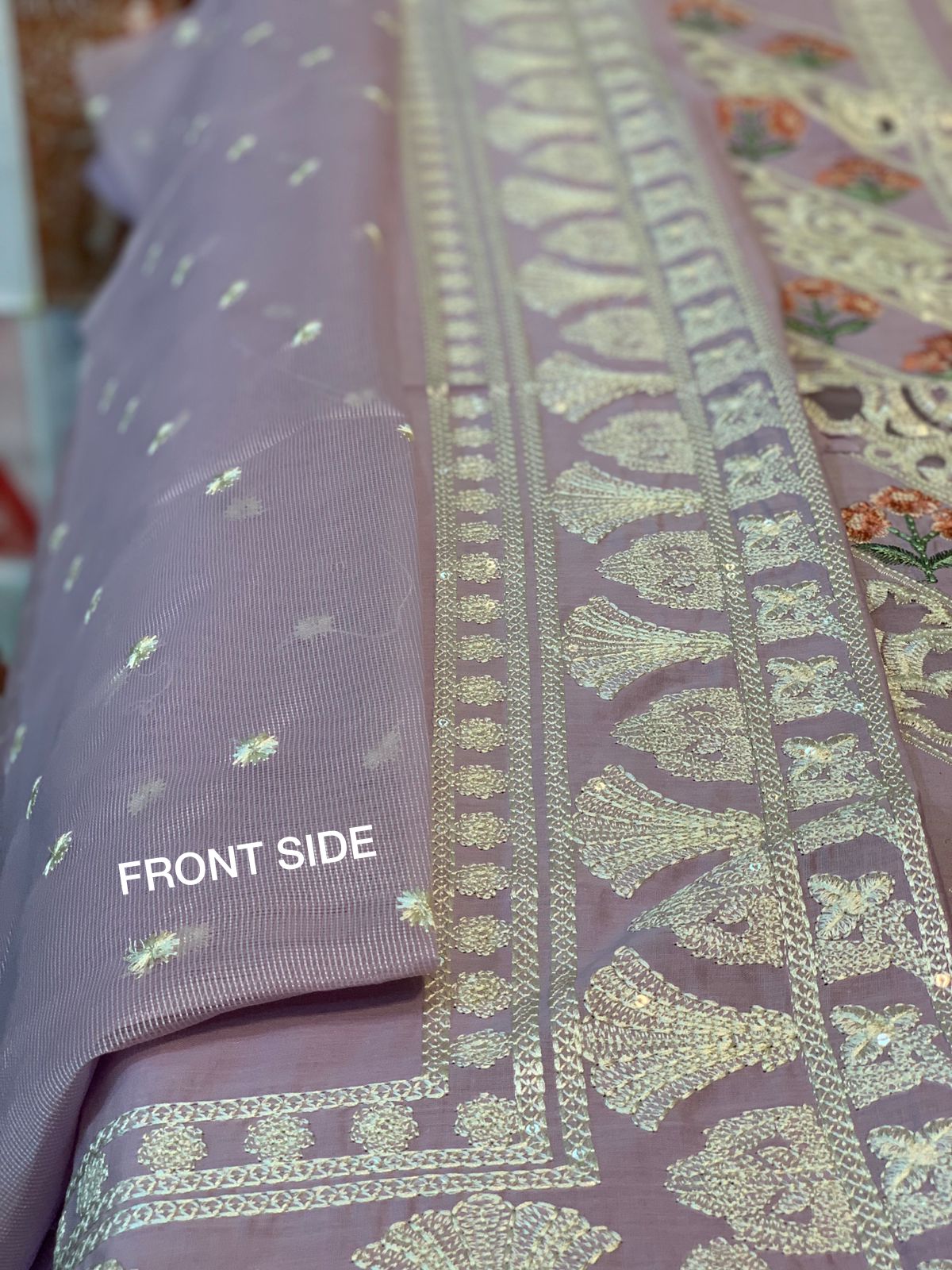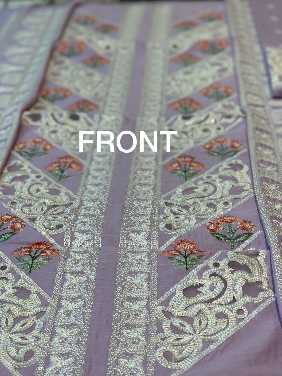 • One Center Panel with Sequins, Organza Appliques and Ghaara Embroidered Bootis Four Chikkankari and Sequins Side Panels for Front and Back Two Extension Side Panels on Woven Net 2 meters Chikkankari and Sequins Daman for Front and Back 0.6 meters Embroidered Sleeves 1.1 meters Chikkankari and Sequins Sleeve Border 2.2 meters Printed Woven Net Dupatta 2 Embroidered Pallus for Dupatta 4.5 meters Embroidered Border for Dupatta Lengths 2.5 meters Solid Dyed Pant