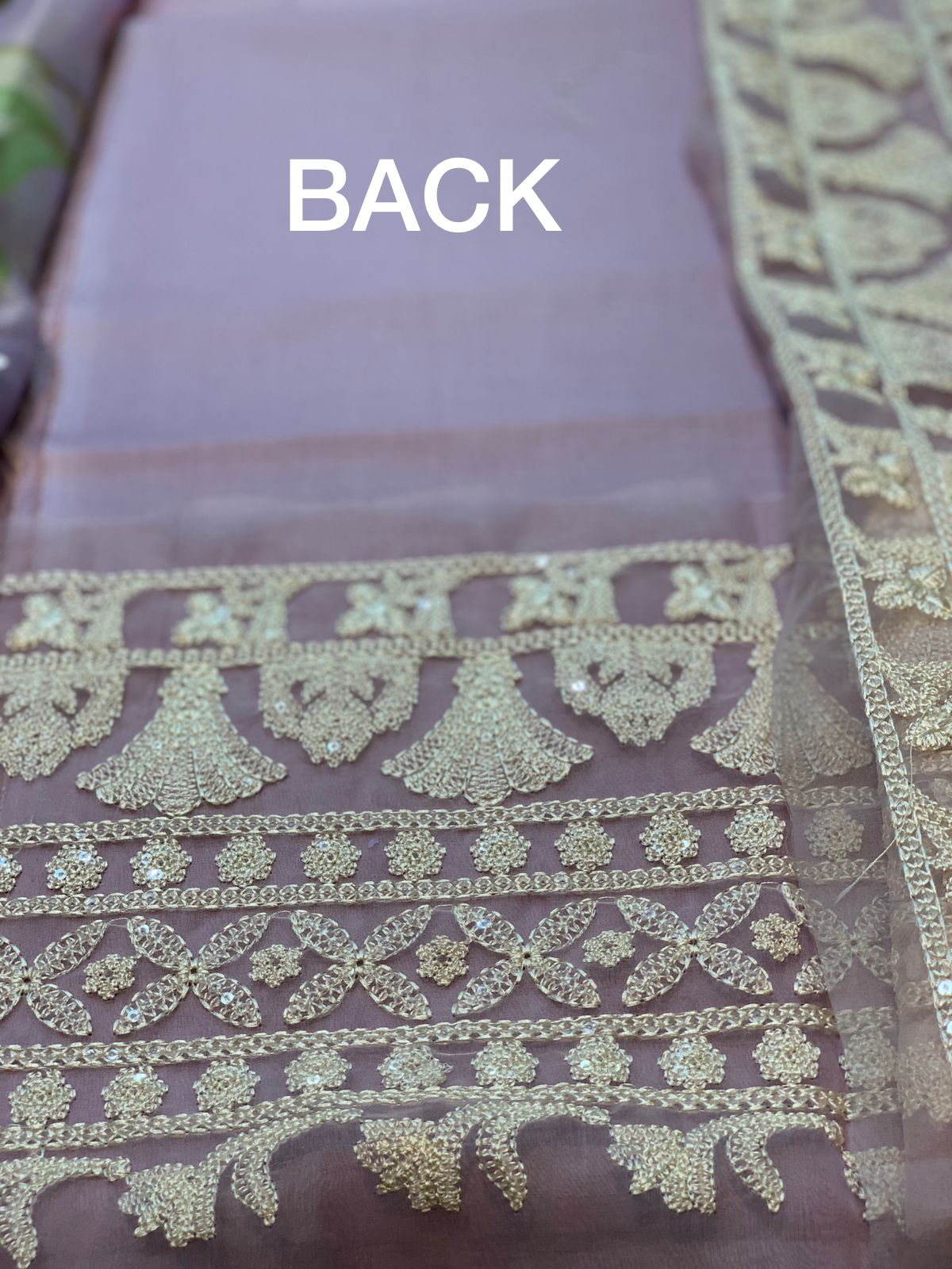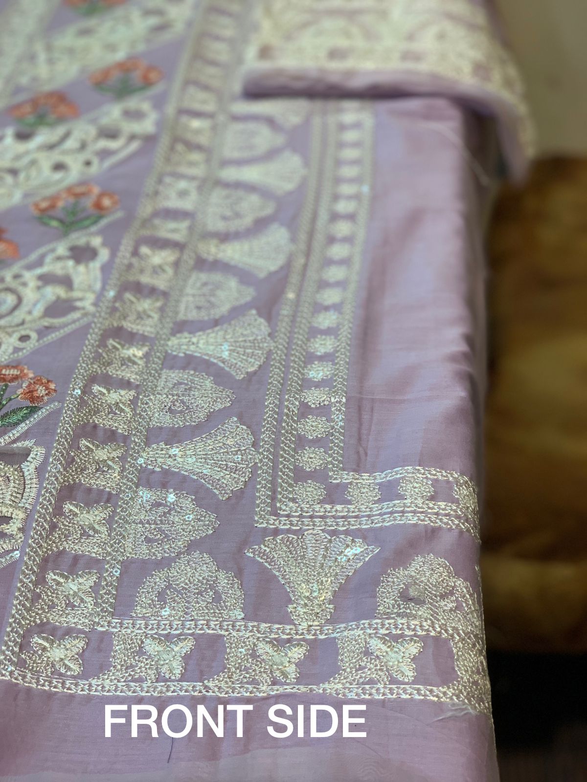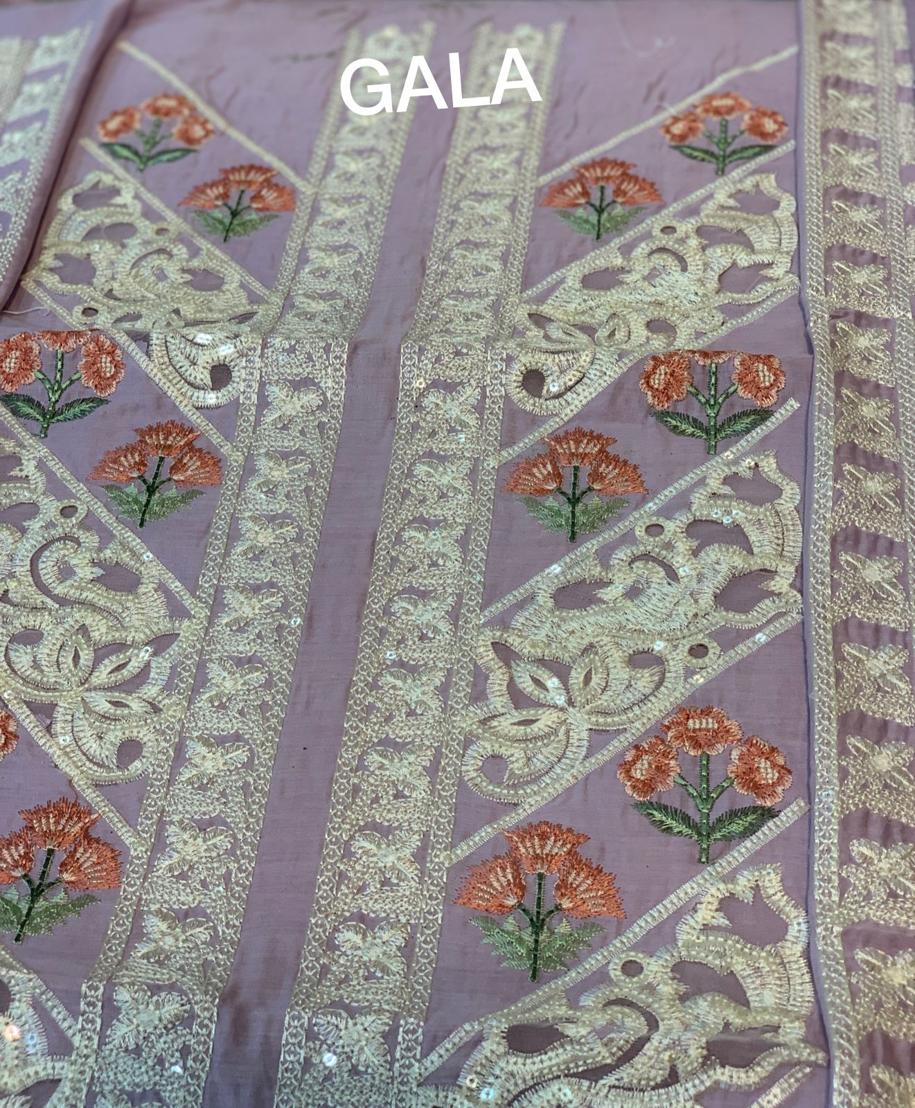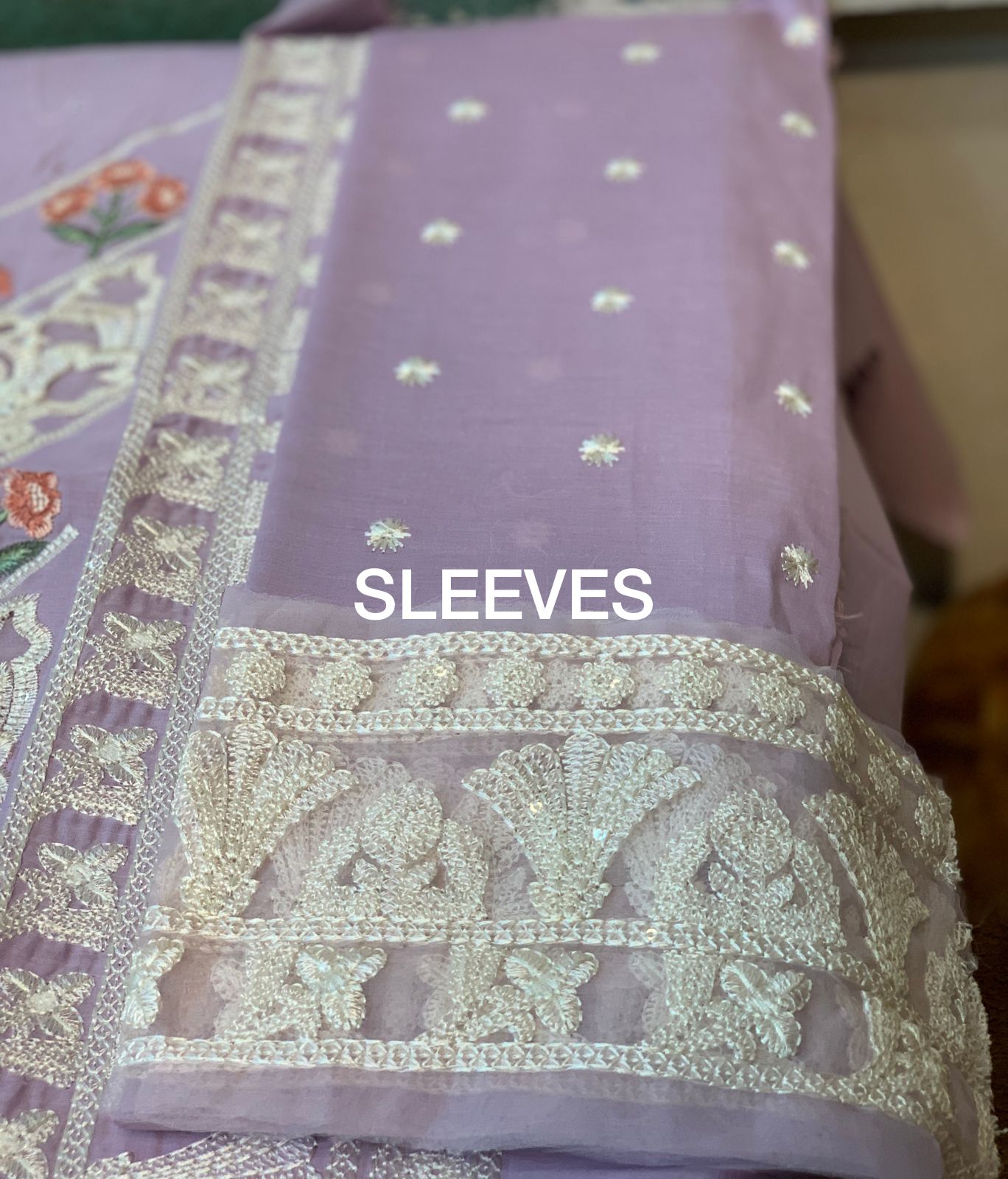 • One Center Panel with Sequins, Organza Appliques and Ghaara Embroidered Bootis Four Chikkankari and Sequins Side Panels for Front and Back Two Extension Side Panels on Woven Net 2 meters Chikkankari and Sequins Daman for Front and Back 0.6 meters Embroidered Sleeves 1.1 meters Chikkankari and Sequins Sleeve Border 2.2 meters Printed Woven Net Dupatta 2 Embroidered Pallus for Dupatta 4.5 meters Embroidered Border for Dupatta Lengths 2.5 meters Solid Dyed Pant