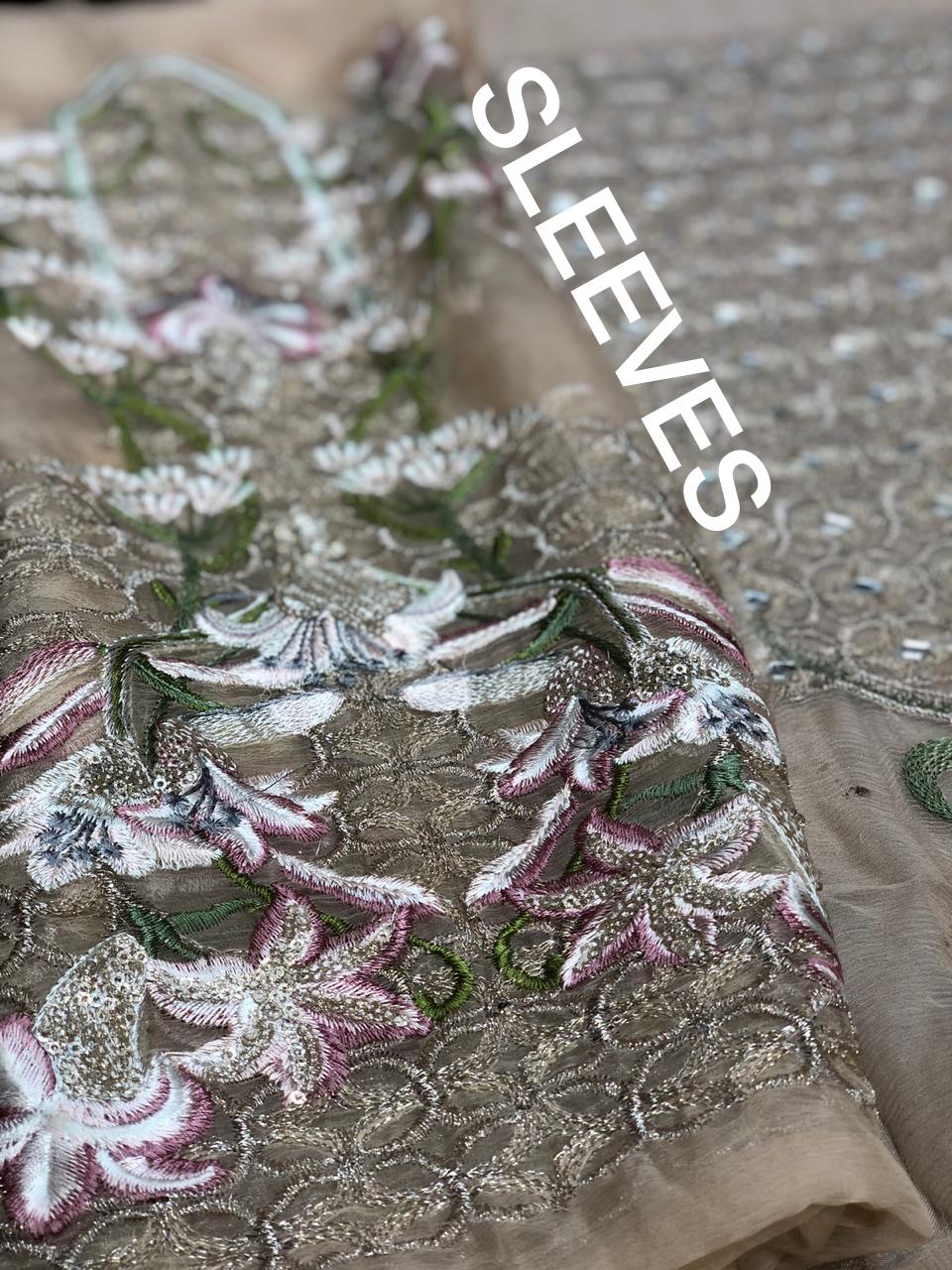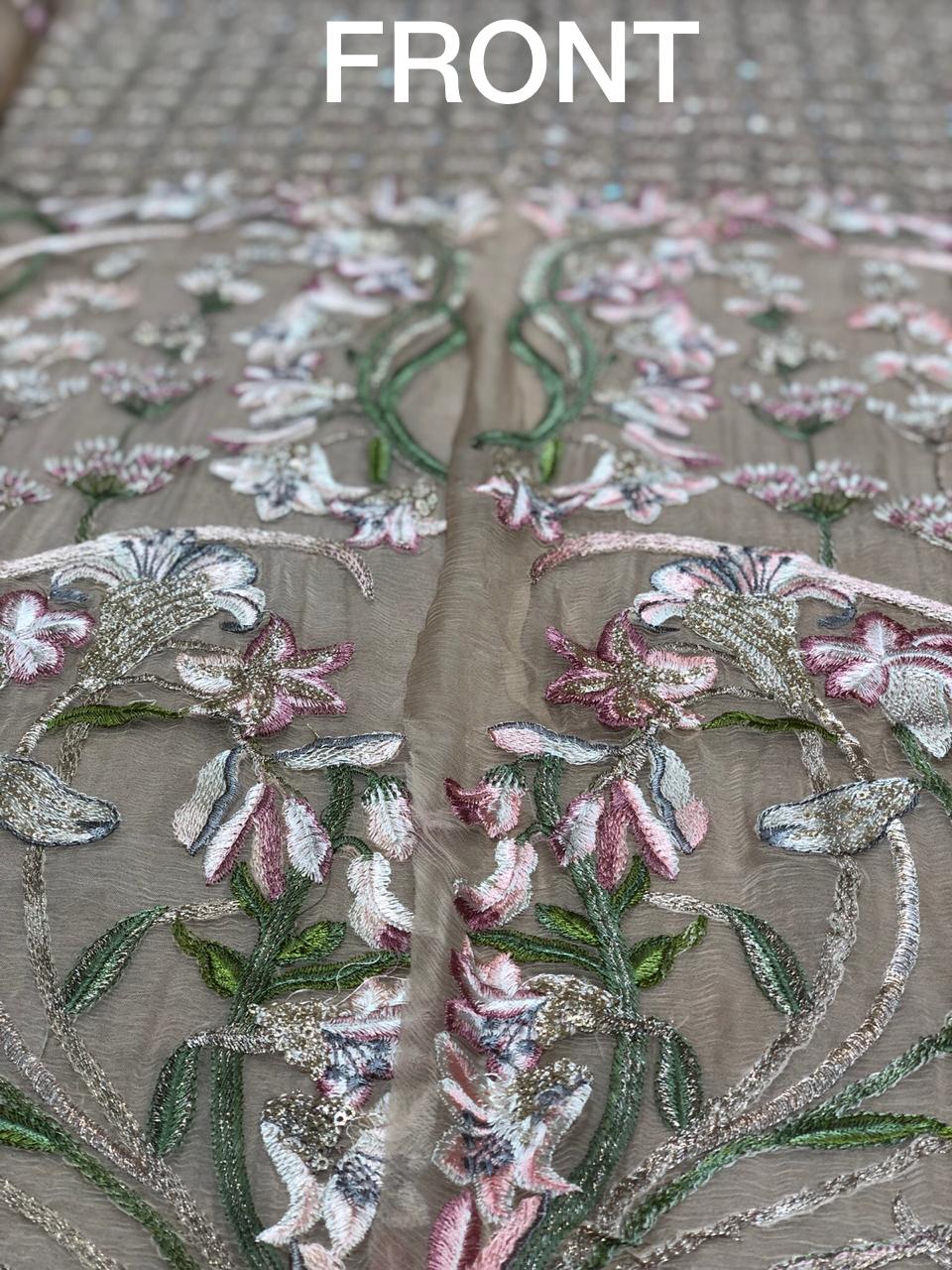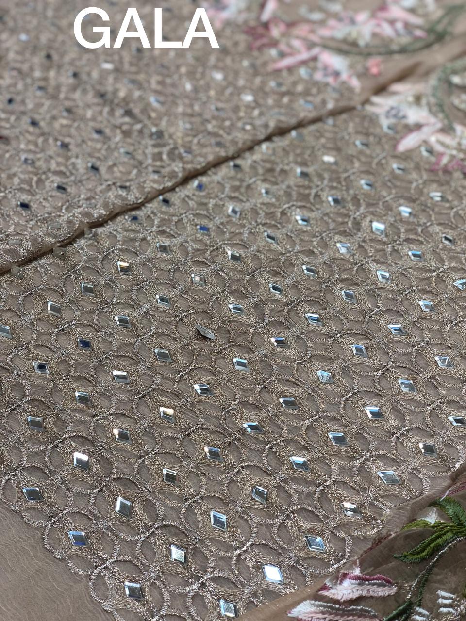 • SHIZA HASSAN LUXURY CHIFFON COLLECTION WITH FOUR CUT MIRROR WORK ON FRONT WITH EMBROIDERED CHOFFON DUPATA AND DYED RAW SILK TROUSER 3PCS COMPLETE DRESS SAME AS ORIGINAL