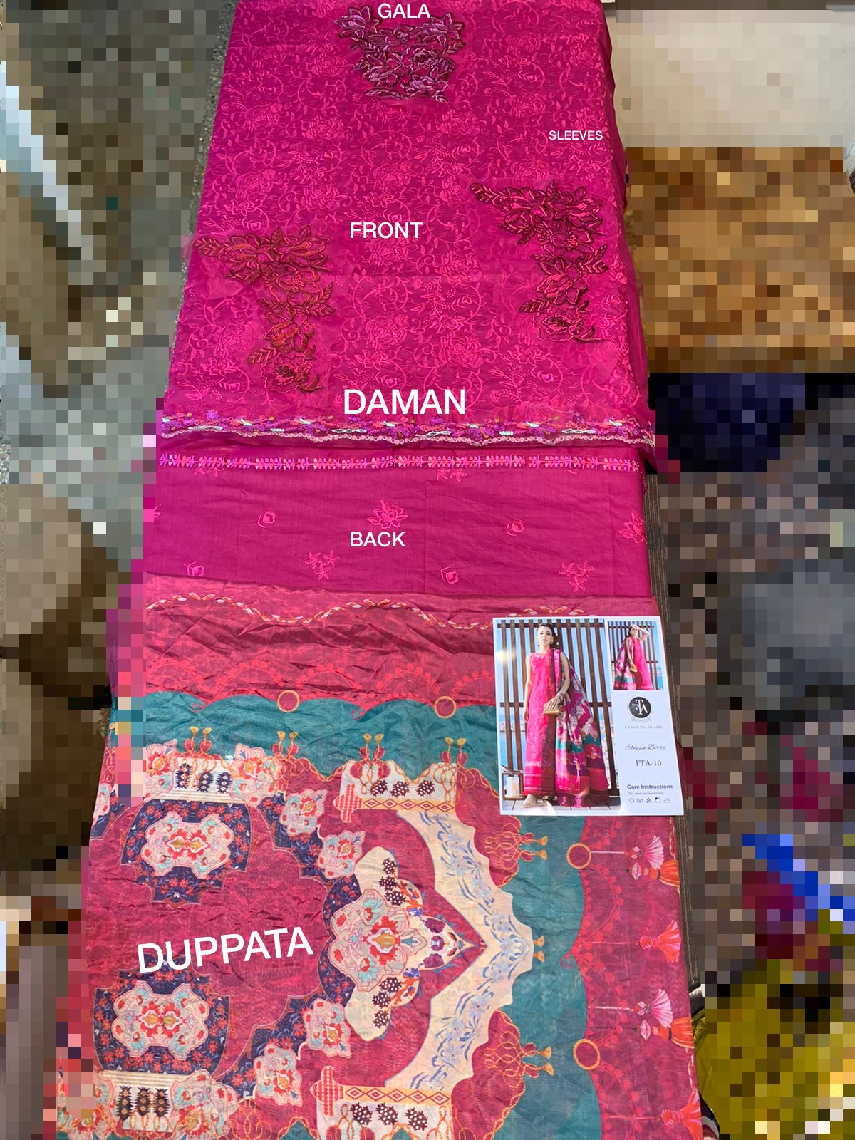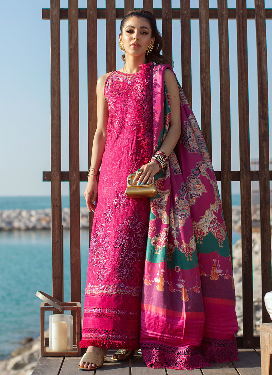 • • Shirt front schiffli on lawn 1.2 meters • Shirt back schiffli on lawn 1.2 meters • Shirt sleeves schiffli on lawn 0.75 meters • Daaman cutwork patch on lawn 2 patches • Shoulder cutwork patch on lawn 2 patches • Thick embroidered border on organza 1.25 meters • Thin embroidered border on organza 1 meters • Printed pure silk dupatta 2.5 meters • Matching weaved jacquard pants 2.5 meters