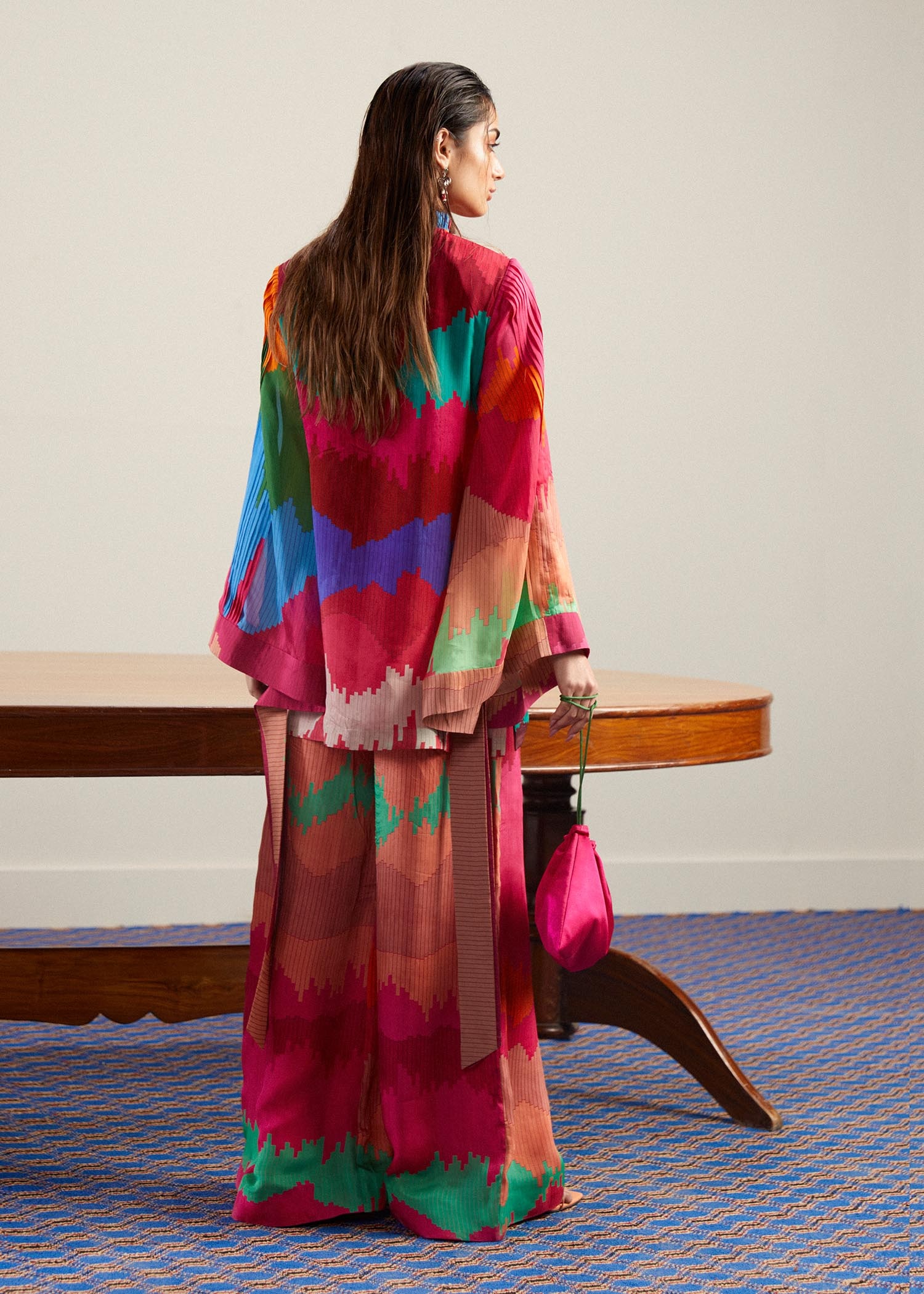 • A regal matching separate printed outfit in beautiful silk fabric. The multicoloured print brings out a chic look. The shirt has green and hot pink satin silk details on the sleeves and the neckline. It is paired with printed culottes with hot pink patch at the bottom.