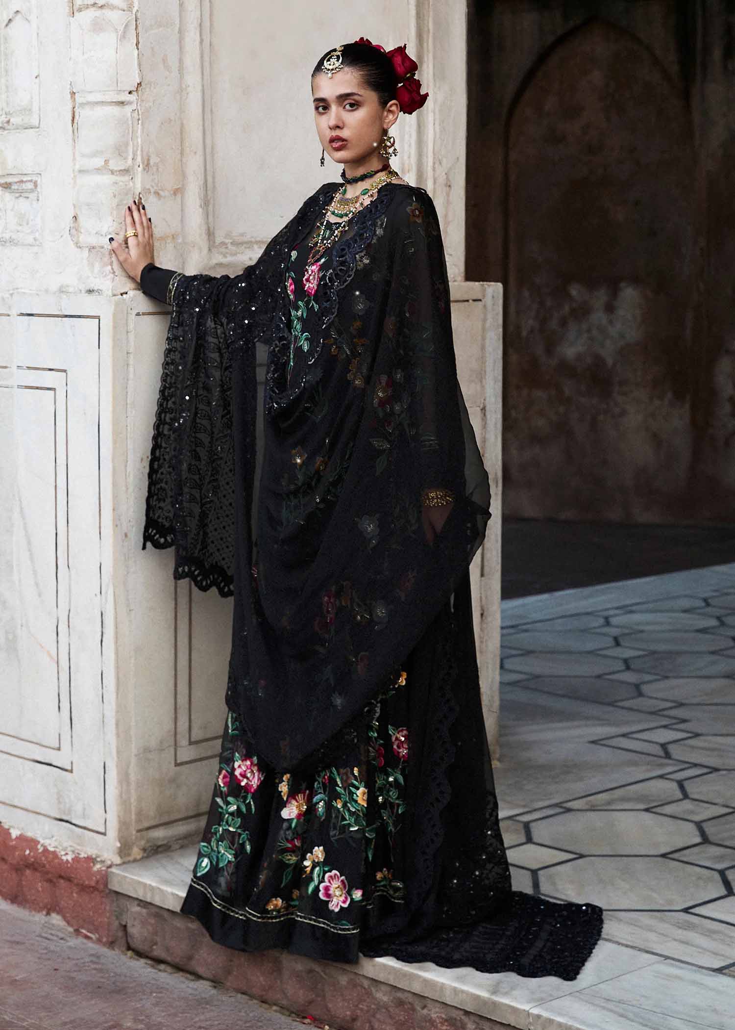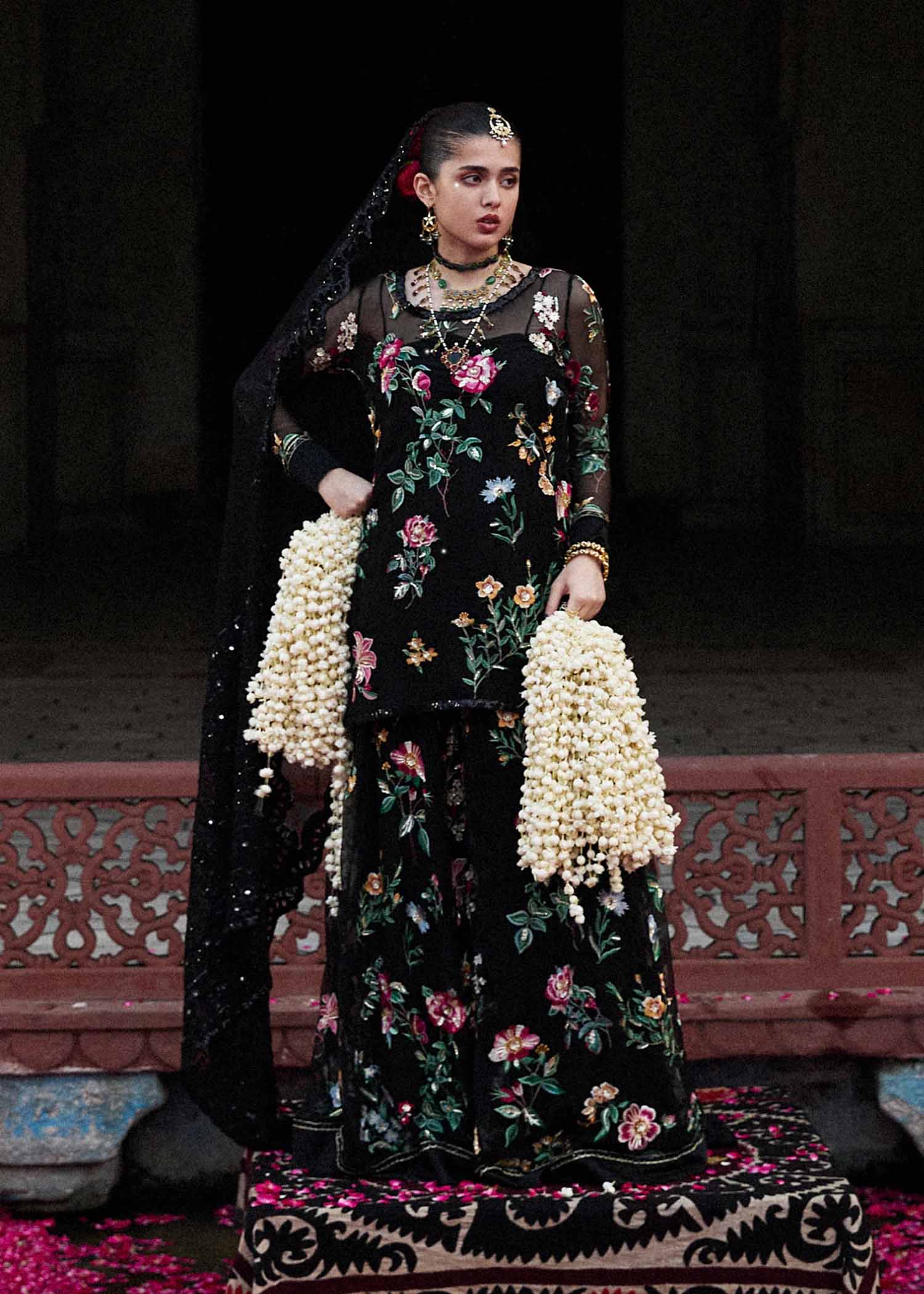 • A delicate black chiffon sharara set, adorned with vibrant multicolored floral embroidery, gold sequins accents, finished with satin silk color blocks and intricate tilla trim at the hem. Embellished with black sequin trims at the hem and neckline, and tassels at the back. Paired with a stunning black chiffon dupatta, featuring black sequin and panni accents, and delicate scalloped borders.