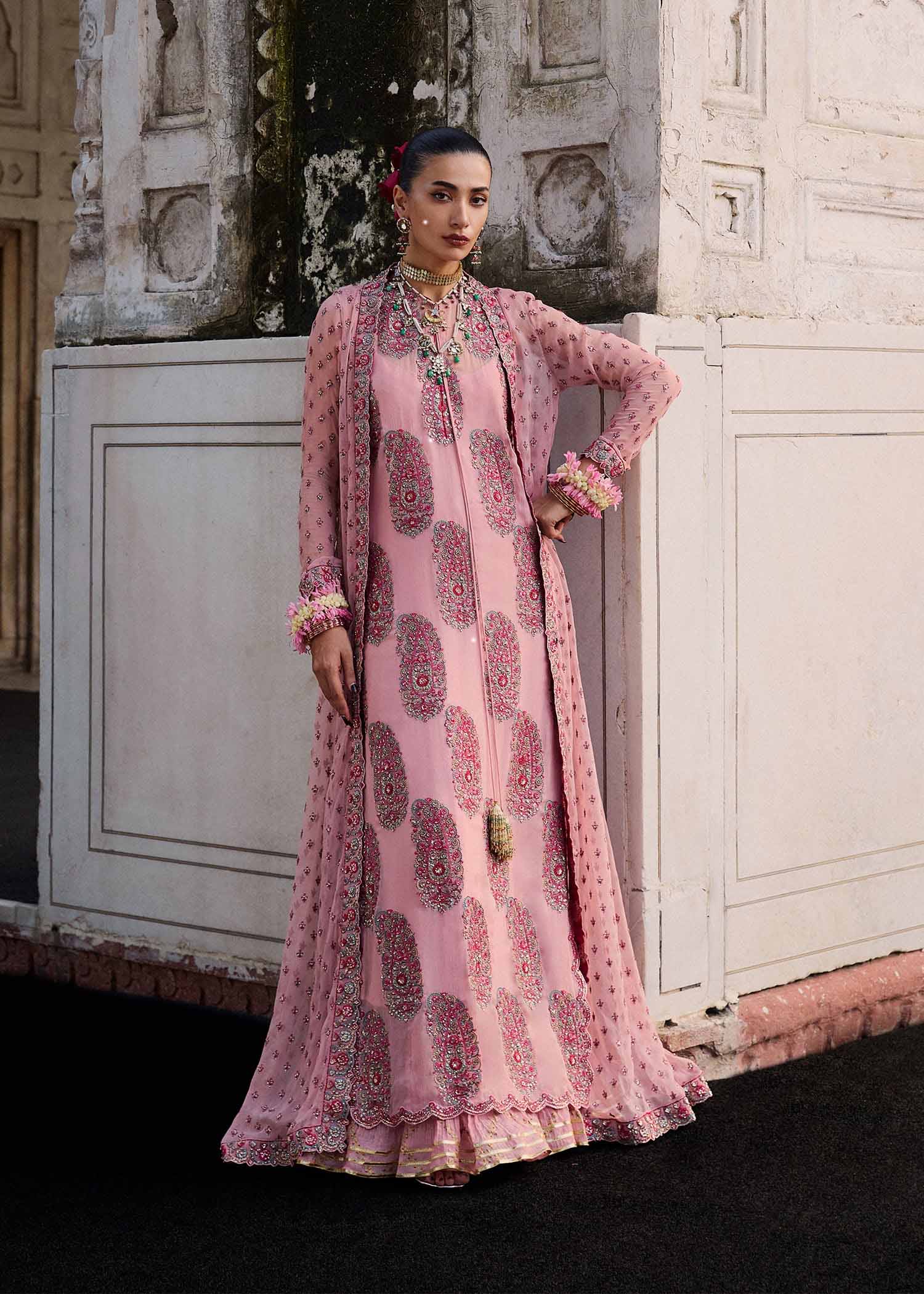 - A delicate powder pink Organza shirt, adorned with vibrant multicolor embroidered paisley motifs, scalloped borders, and tassel detailing at the neckline and golden sequin accents. Paired with a stunning floor-length chiffon jacket adorn with delicate multicolored stitch work and embroidered borders, finished with hot pink printed facing. Complemented by a crushed silk sharara, screen-printed with a vibrant design and embellished with gotta trimmings at the hem, this ensemble exudes playful elegance.
