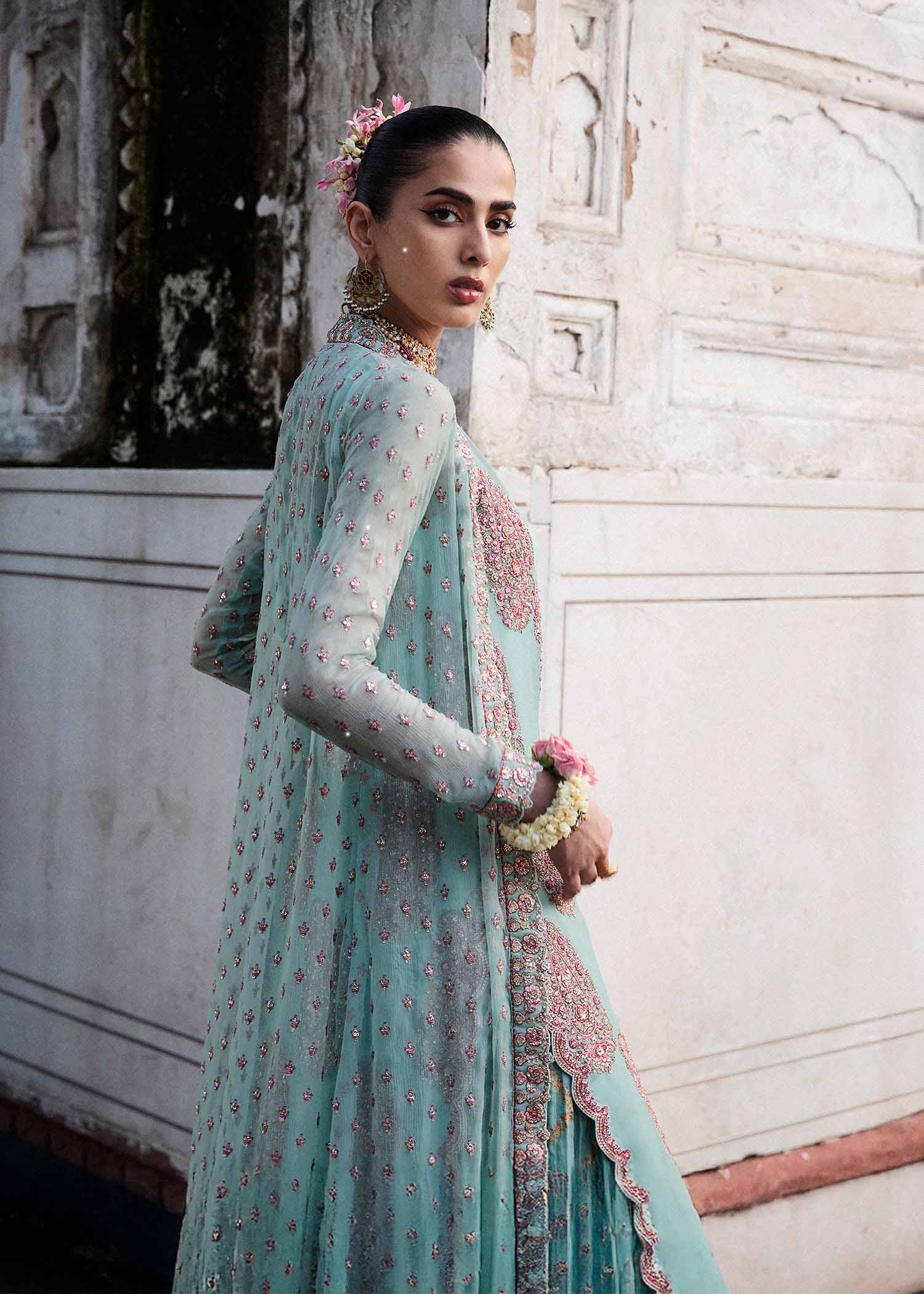 - An ice blue organza shirt, adorned with vibrant multicolor embroidered paisley motifs, scalloped borders, and tassel detailing at the neckline and golden sequin accents. Paired with a stunning floor-length chiffon jacket adorn with delicate multicolored stitch work and embroidered borders, finished with blue digitally printed facing. Complemented by a crushed silk sharara, screen-printed with a vibrant design and embellished with gotta trimmings at the hem, this ensemble exudes playful elegance.