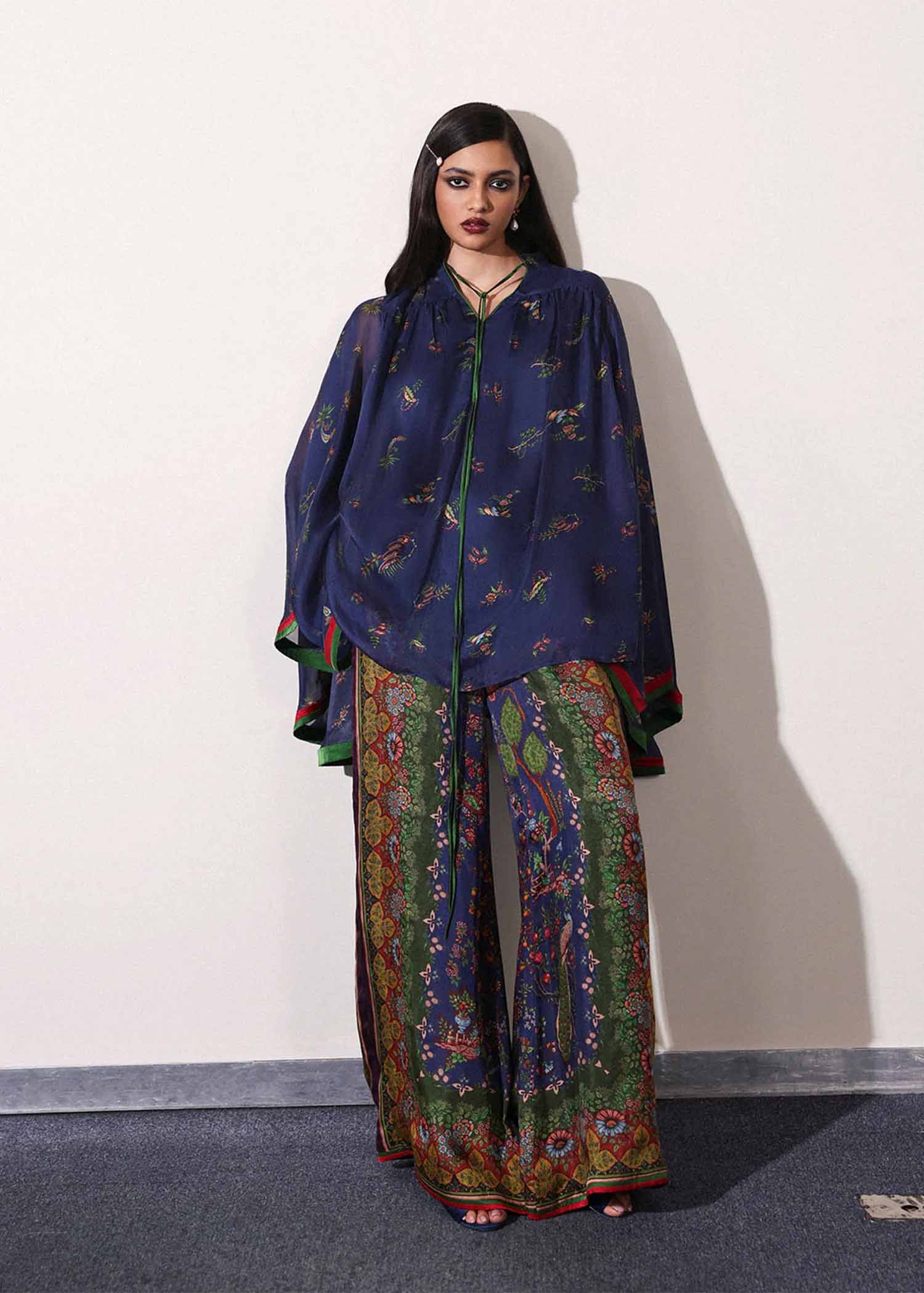 • A midnight blue mid-thigh length floral printed silk shirt with red and green satin silk trims on full-circle sleeves and green satin tassel detailing on the neckline. Paired with multicolored floral printed wide-leg pants for a bold, effortless statement.