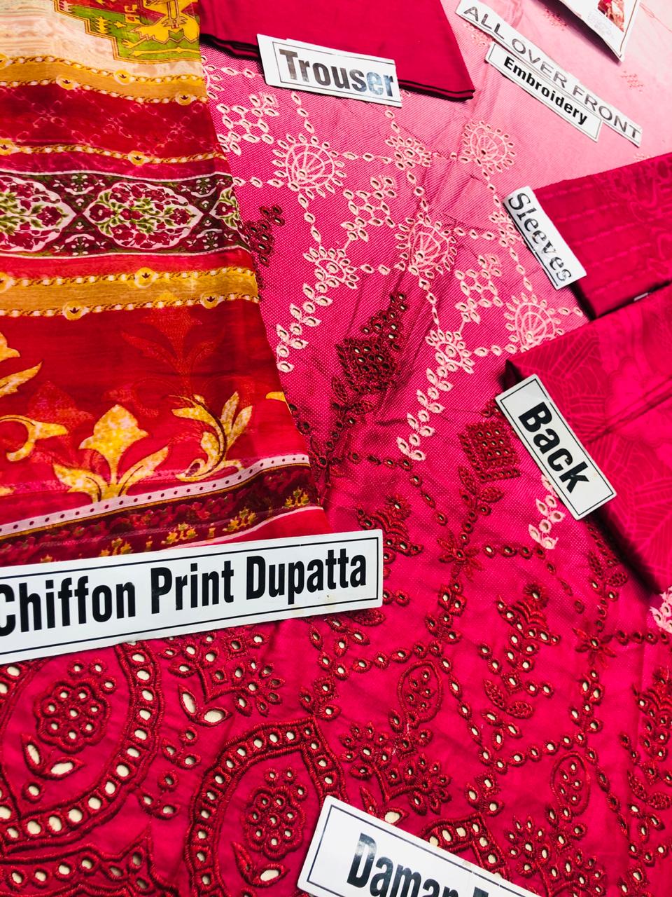 • EMBROIDERY CHIKENKARI FRONT AND PRINTED SHAFOON DUPATTA