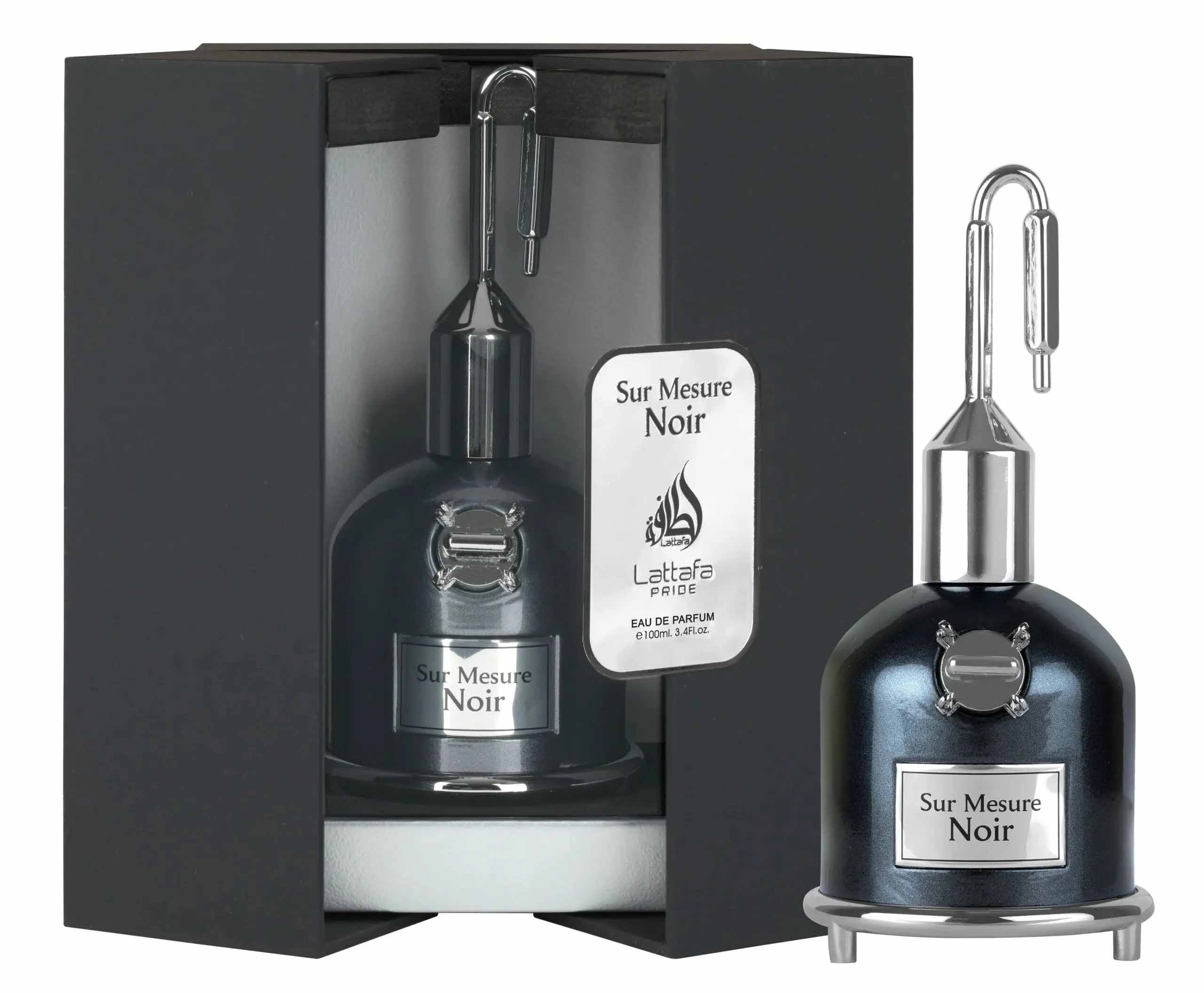 • Sur Mesure Noir by Lattafa Perfumes is a luxury men’s fragrance in Pakistan, crafted for bold elegance. It opens with bergamot, cinnamon, nutmeg & pimento berries, flows into lavender, Mahonial & elemi, and settles into a deep base of patchouli, sandalwood, cedarwood, vetiver & amber. A long-lasting Arabic perfume that embodies strength, warmth, and timeless style.