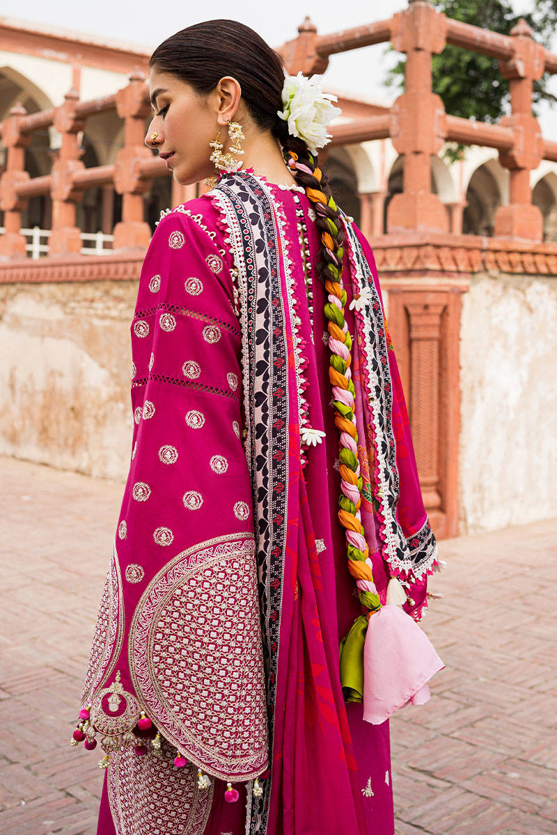 • Gulabo is our Turkish rose pink festive lawn ensemble. The shirt features pearl white silken threadwork embroidery depicting a decorative archway and singular chand bali jewelry motifs across the neckline. The borders are adorned in a typical Deccani floral embroidery motifs. The sleeves feature a complimentary Mughal jail pattern. The matching dupatta is printed with an orange-hued floral vine and a black-and-white border running across all sides. The ensemble is paired with a contrasting pearl white pajama featuring scrolls of beautiful embroidery across the hem.