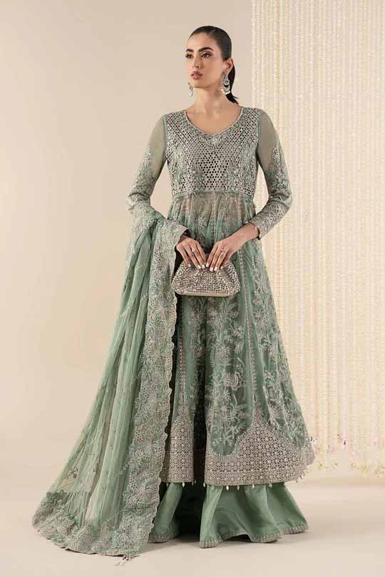 • Frock Round Neckline Sequin Embellished Bodice Embroidered Frock Panels Pearl Detailing On Side Seams Sequins Embellished Border Embroidered Sleeves With Sequin Embellished Border Crystal & Pearl Drop Detailing On Sleeves Border Color: Green Fabric: Net