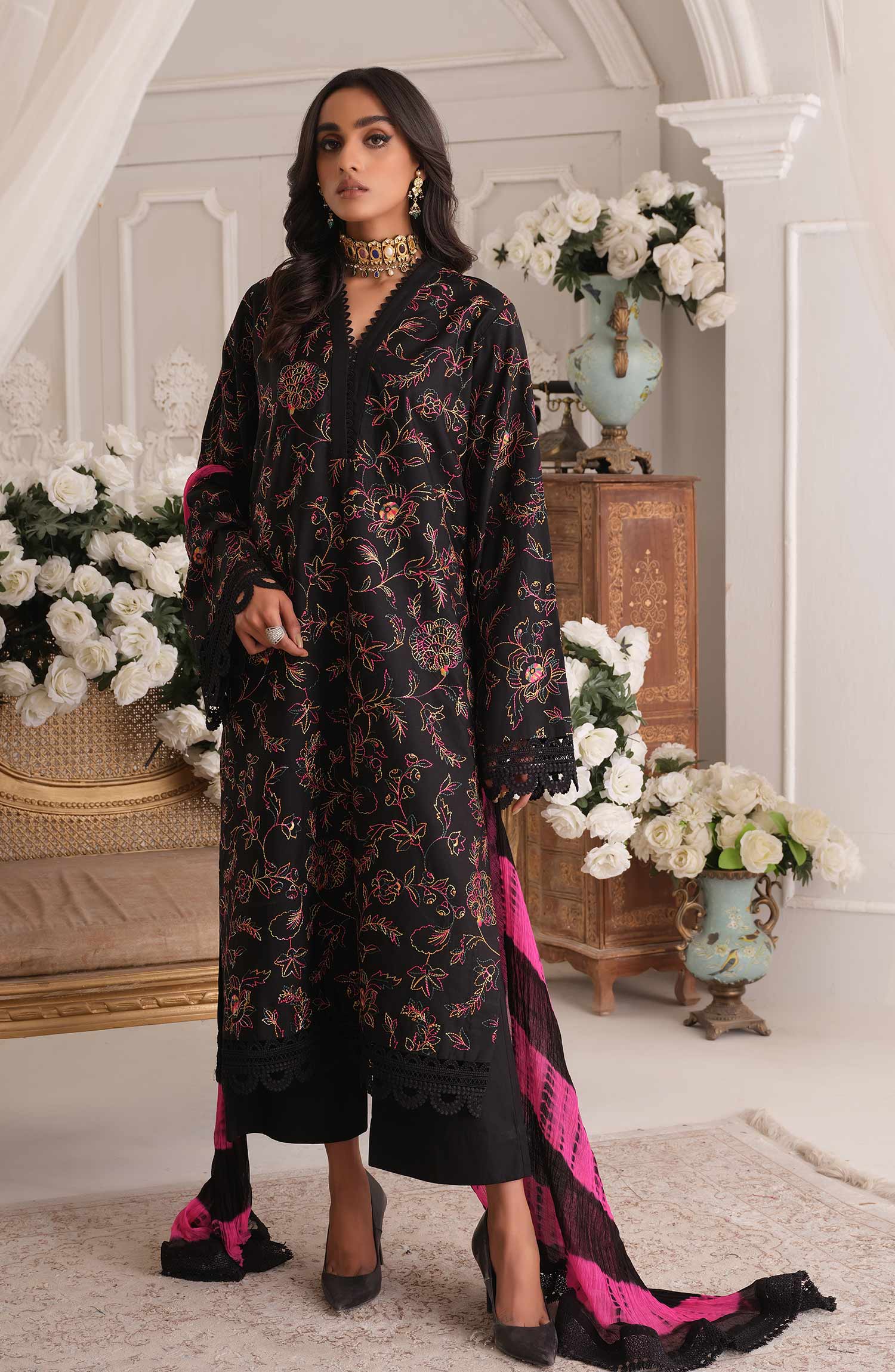 • Shirt Fabric: Embroidered lawn Dupatta: Tie & dye chiffon chiffon Trouser: Cotton