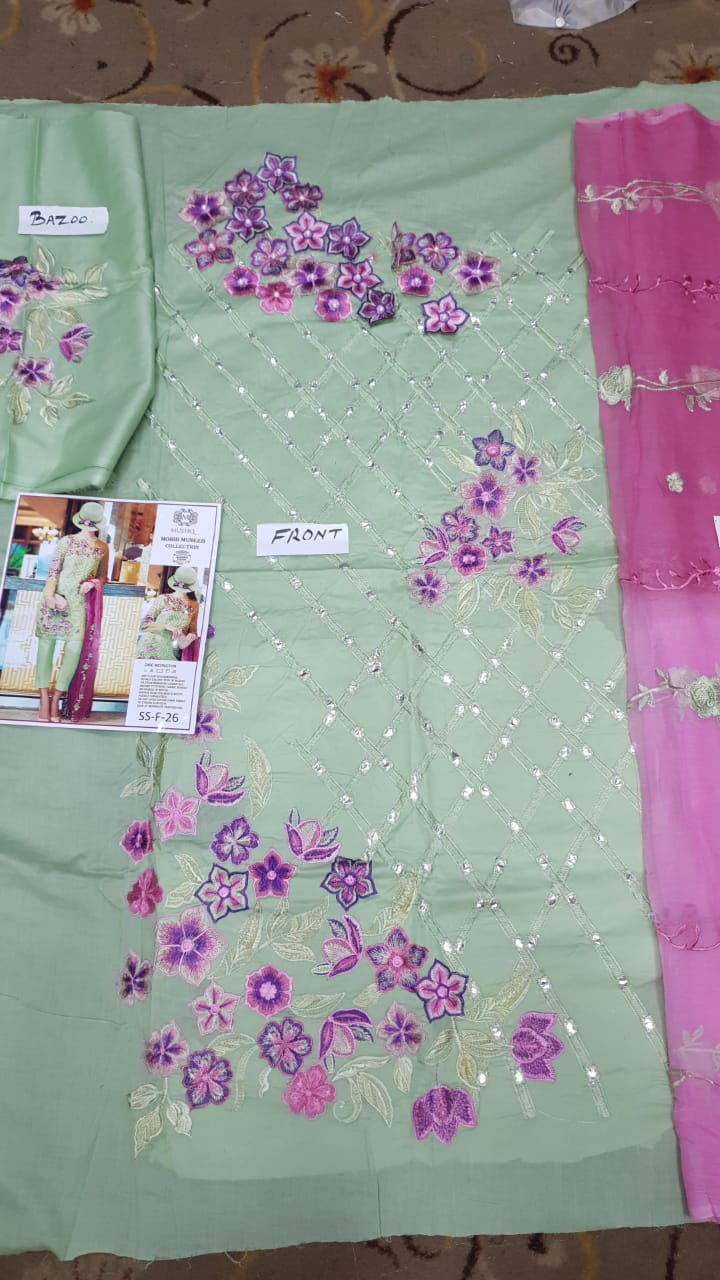 • FULL FRONT EMBROIDERY WITH 3-D FLOWERS ON DAMAN WITH MOTI WORK