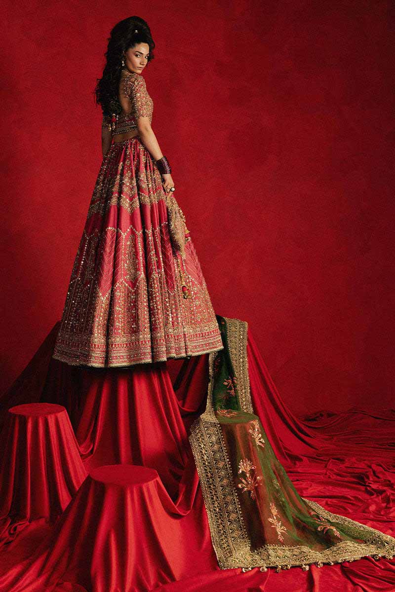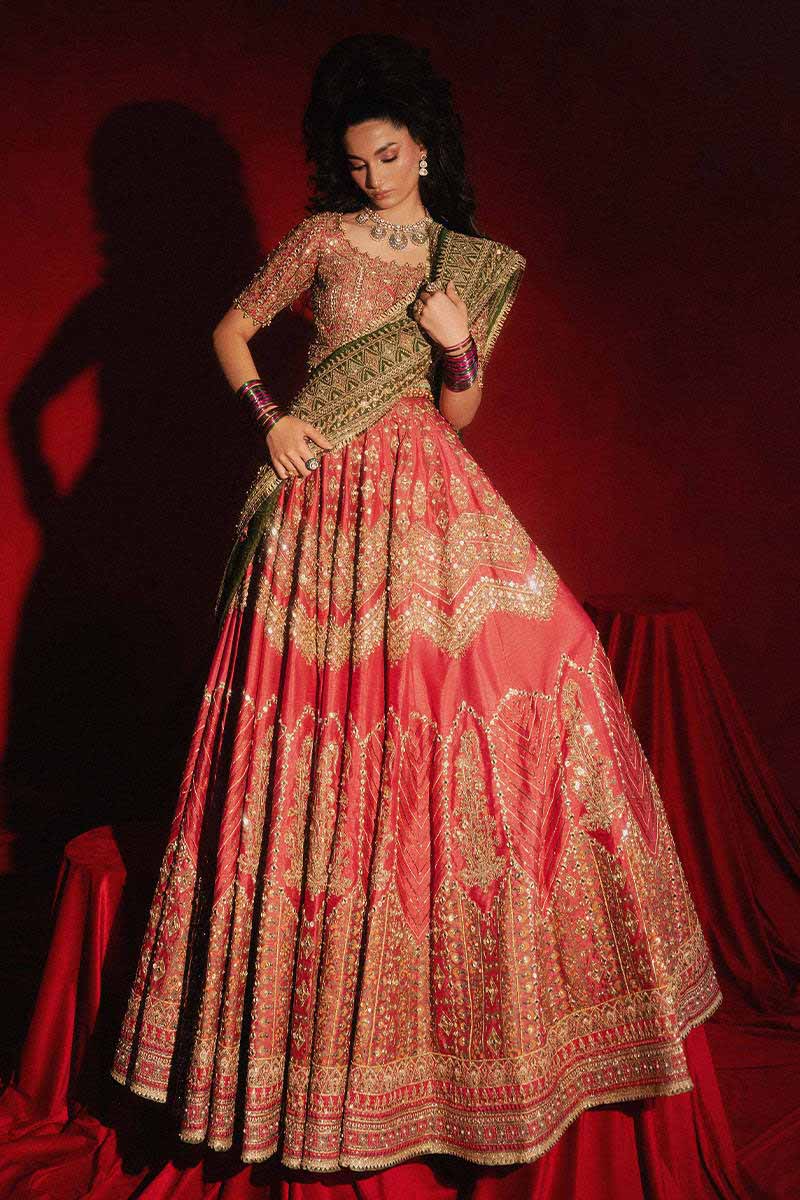 • A garden in full bloom, Gul Badan iscrafted from rose pink Indian silk and soaked in old-school romance. The choli is short, with demure half sleeves dusted with judiciously placed mirror work and glints of metallic thread embroidery. The lehenga begins at the waist with chevron patterning and evolves into diamond-shaped panels, each box housing a Mughal floral motif rendered in a mix of silken thread embroidery, block print, and tiny mirrors that glint like dew. Beneath this garden of geometry, vertical scrolls rise like creeping vines embroidered delicately in lines that mimic antique architectural flourishes. The hem is finished with multiple embroidered borders that layer like sari pallus from a bygone era. A contrasting organza dupatta in lush green explodes with large, bold floral Mughal motifs in gota and adda work, framed in broad gold borders with embroidered trims running along all four edges.