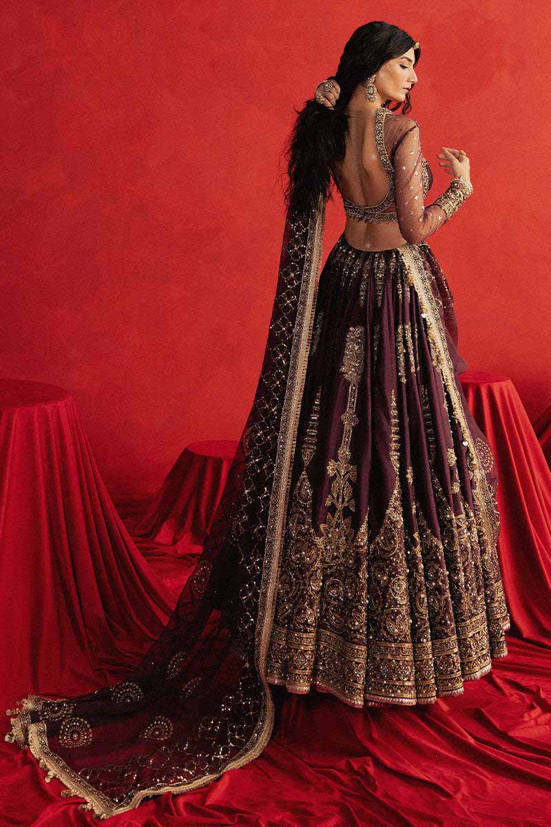 • Named after the fierce poet-princess, Zeb-un-Nissa is rendered in royal purple Indian silk, this ensemble is saturated with opulence: silk appliqués, block print, adda embroidery, and mirror shimmer. The choli has full sheer sleeves that are dusted with golden motifs and framed with layered decorative borders in embroidery, sequins, and beads. Its neckline is traced with gold floral vines that curl like verses from a ghazal. The lehenga begins with persian boteh motif, then transitions into slender cypress trees, before bursting into a symphony of circular vines and paisley patterns all block printed in gold and embroidered by hand with sequins, mirror work, and metallic threads. The hemline is wrapped in multiple embroidered borders layered with gota patti and finishing trims. The organza dupatta is no less regal, featuring decorative roundels and Mughal jaali-inspired motifs, edged with thick gold borders and beaded tassels that flirt with the wind