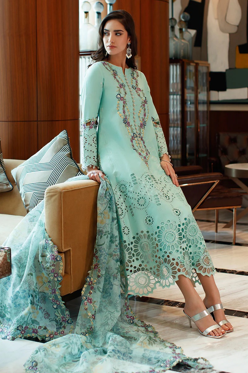 • Make waves in our sea blue ensemble, Opal, adorned with exquisite floral 3D embellishments that bring your outfit to life. Look effortlessly chic with a dupatta thats a testament to the beauty of nature.