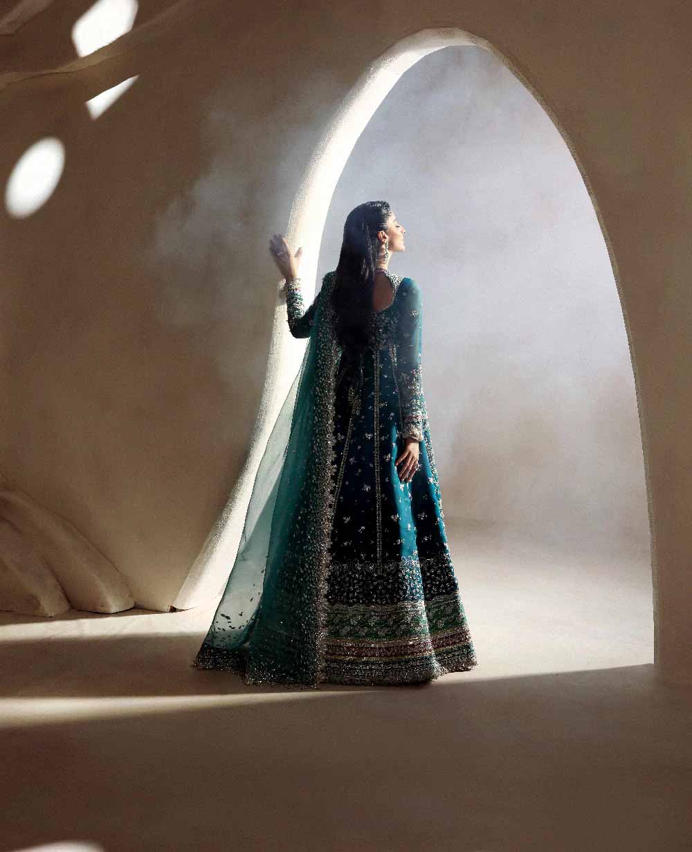 • Delicate silver florals bloom across the fabric catching the light with shimmering sequins and intricate tilla work. The organza paneled pishwas unfurls like a living garden, its soft sage satin border adding depth and contrast, while the organza dupatta edged with sequin kissed leaves whispers the charm of a hidden oasis. As the design flows gracefully down each panel, it weaves a story of enchantment and allure. With adda detailing and a palette of serene hues, this piece becomes a portrait of feminine grace romantic, timeless and effortlessly elegant.