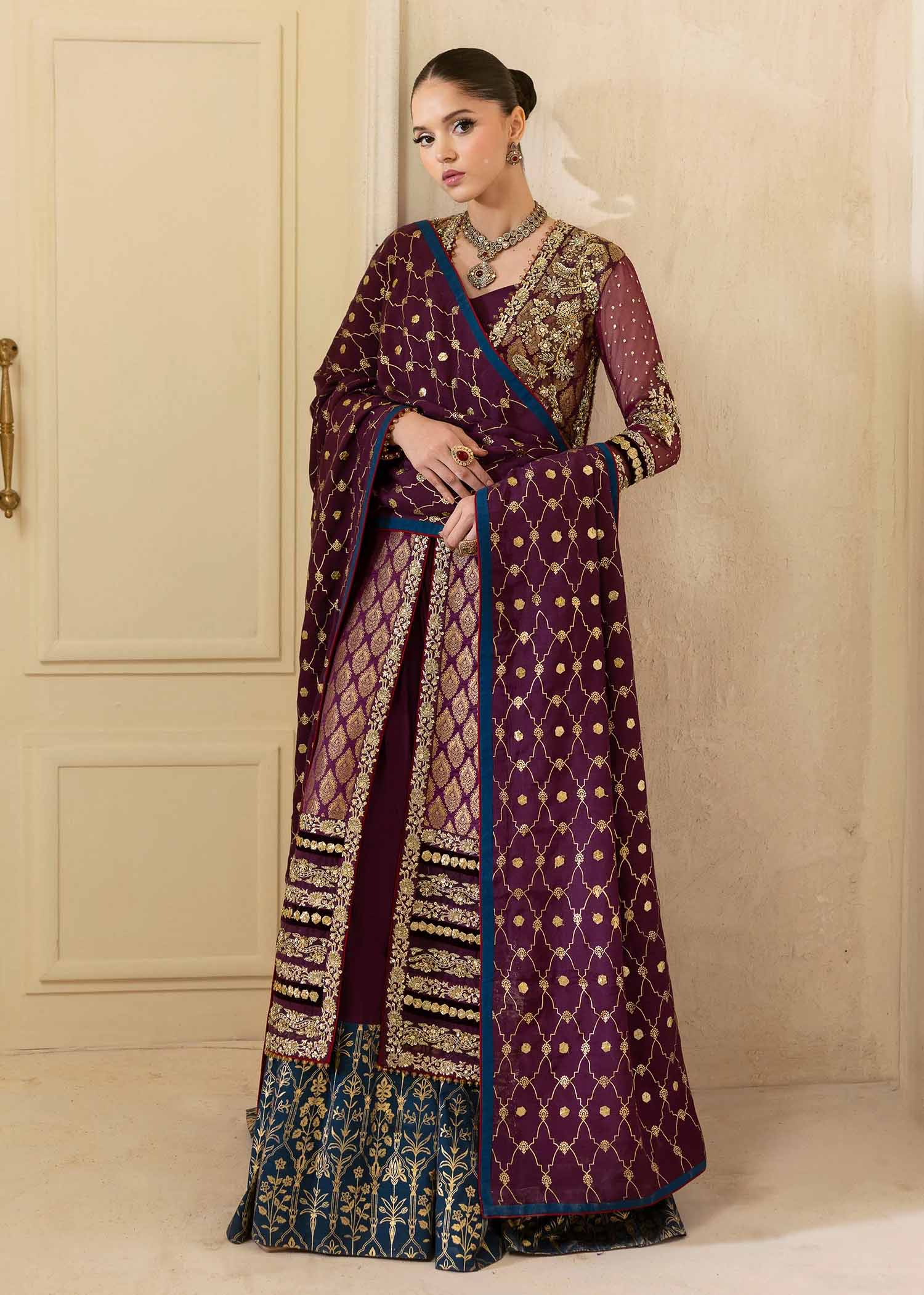 • With its profound plum silhouette, exquisite gold embellishments and contrasting azure accents this majestic ensemble by Saira Shakira redefines festive elegance. A sublime fusion of cutting-edge grandeur and tradition that is sure to bring a statement.
