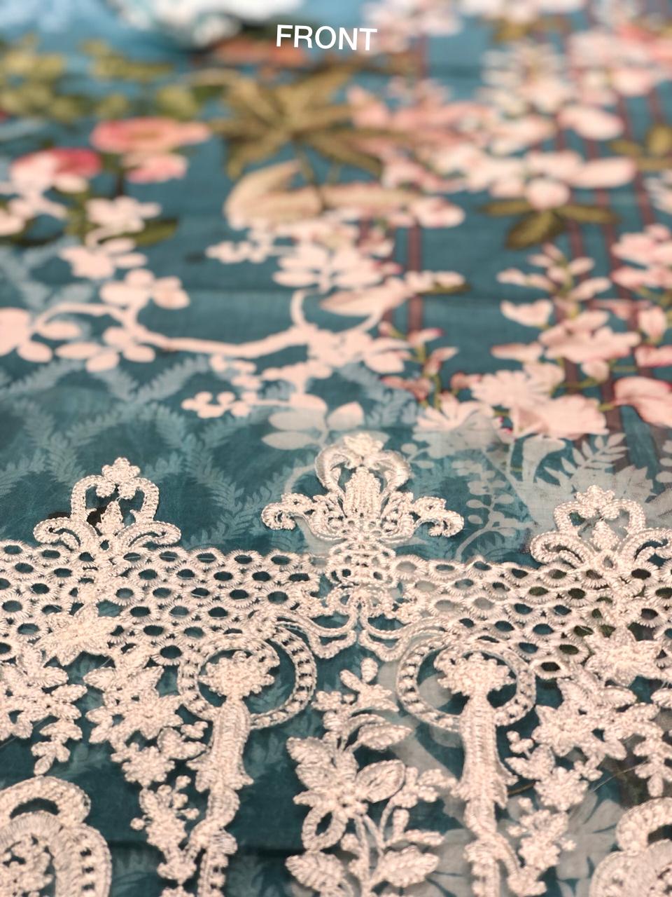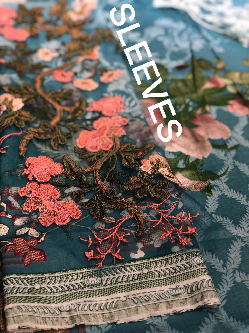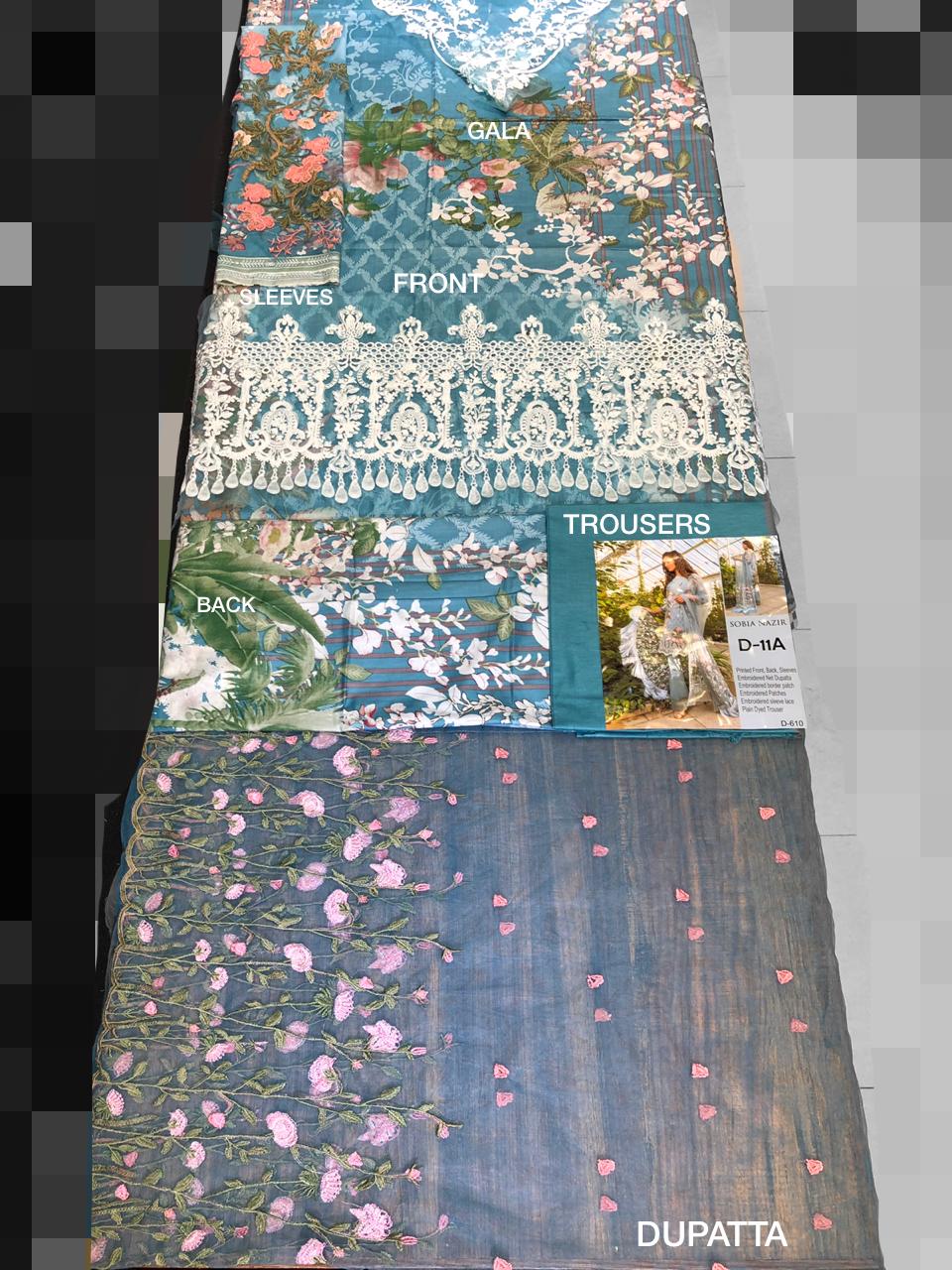 • SOBIA NAZIR KING REPLICA DIGITAL PRIMTED FRONT, DIGITAL PRINT BACK, DIGITAL PRINTED SLEEVES. EMBROIDERED KOREAN BAREEZE NET DUPATA. EMBROIDERED BORDER PATCHES. EMBROIDERED PATCHES. EMBROIDERED SLEEVES LACE.DYED TROUSER 3PCS SAME AS ORIGINAL