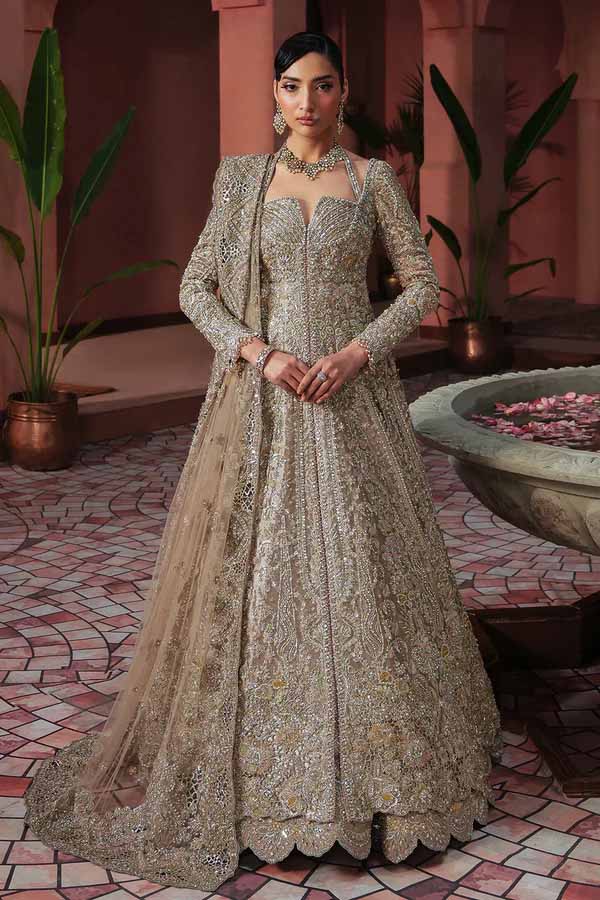 • This bridal masterpiece is crafted in luxe tissue fabric, exuding a luminous sheen that speaks of timeless elegance. Intricate handwork including refined cutwork in soft peach pink and aqua tones is beautifully accented with dabka and fine embellishments, bringing every detail to life. Paired with a sheer net dupatta, the ensemble evokes softness, sophistication, and the quiet power of tradition.