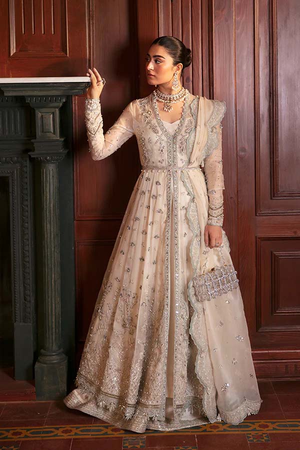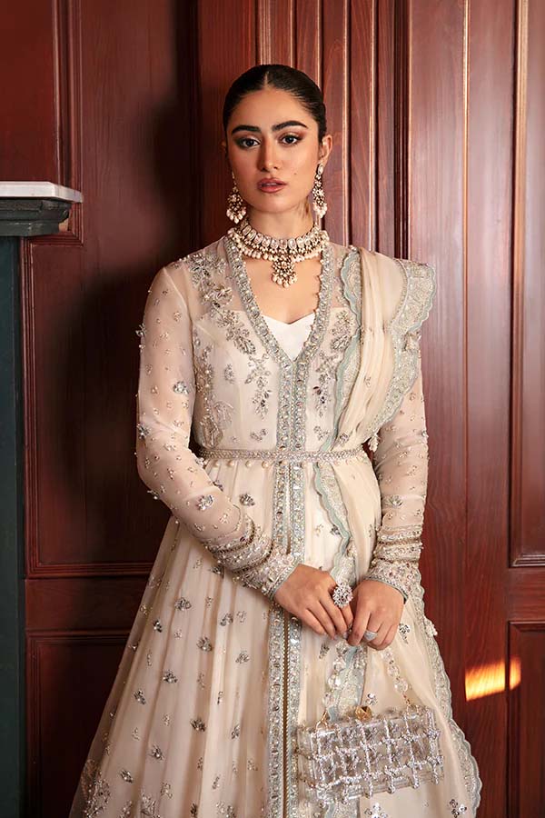 • A vision of elegance and poise, the dress dazzles with its dreamy white organza peshwas shirt infused with hints of misty blue, like a fleeting reverie. Enveloping the wearer in grace, the ensemble is harmoniously completed with a same-toned raw silk shrara, draping gracefully like a flowing cascade of clouds. As a finishing touch, an organza dupatta, gracefully cascading with embroidered patched borders, bestows an air of poetic grace.