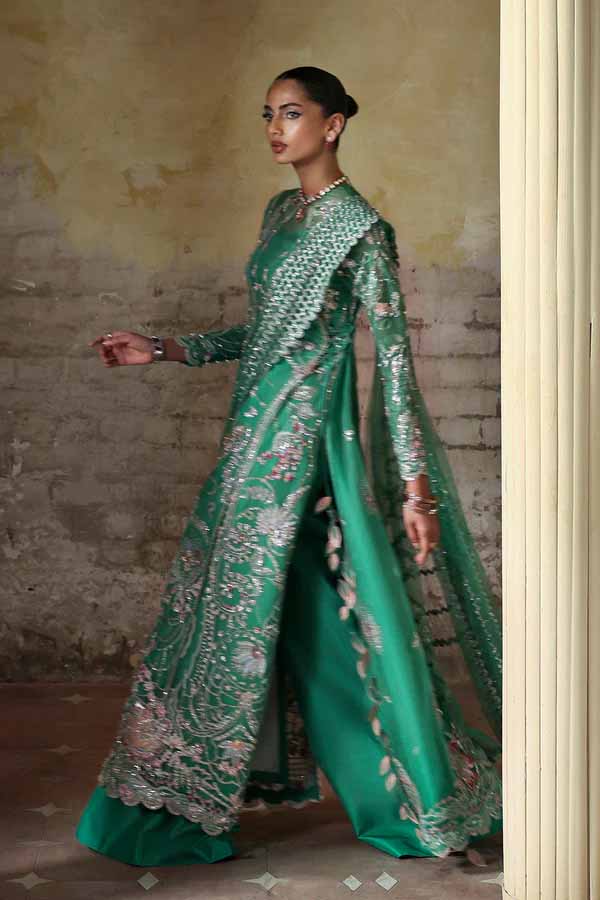 - Front Panels • 1 Pc – Embroidered & Hand-Embellished Center Panel (Organza) • 1 Pc – Embroidered & Hand-Embellished Center Down Patch (Organza) • 1 Pc – Embroidered & Hand-Embellished Front Right Panel (Organza) • 1 Pc – Embroidered & Hand-Embellished Right Down Patch (Organza) • 1 Pc – Embroidered & Hand-Embellished Front Left Panel (Organza) • 1 Pc – Embroidered & Hand-Embellished Left Down Patch (Organza) • 2 Pc – Embroidered & Hand-Embellished 3D Flowers (Border) Sleeves • 2 Pc – Embroidered & Hand-Embellished Sleeves (Organza) Back • 1 Pc – Embroidered Back (Organza) • 1 Pc – Embroidered Back Border (Organza) Dupatta • 3 Yards – Embroidered Dupatta (Net) Trouser & Inner • 2 Yards – Dyed Inner (Silk) • 4 Yards – Dyed Trouser (Silk)