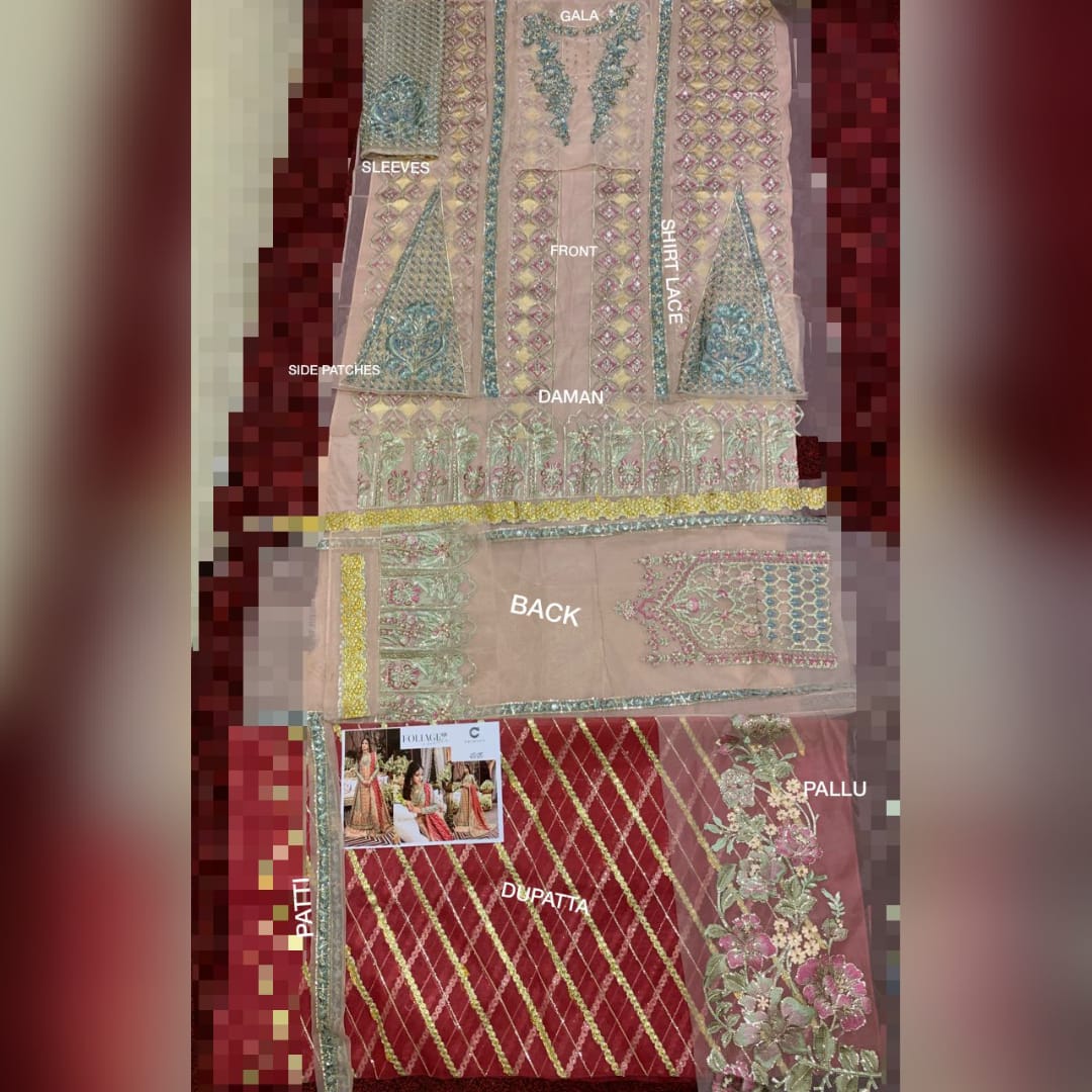 • 2.6 meters Sequined Tareez Patti Two Sequined and Embroidered Godet Panels Sequined and Embroidered Daman Border Sequined and Embroidered Daman Extension Border