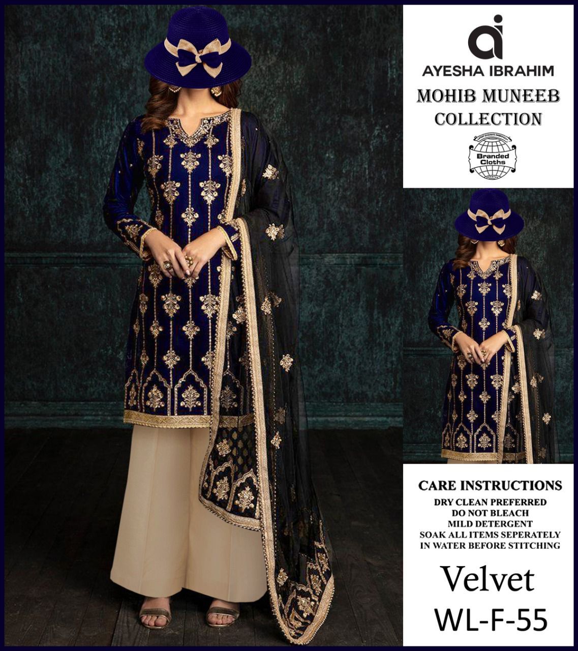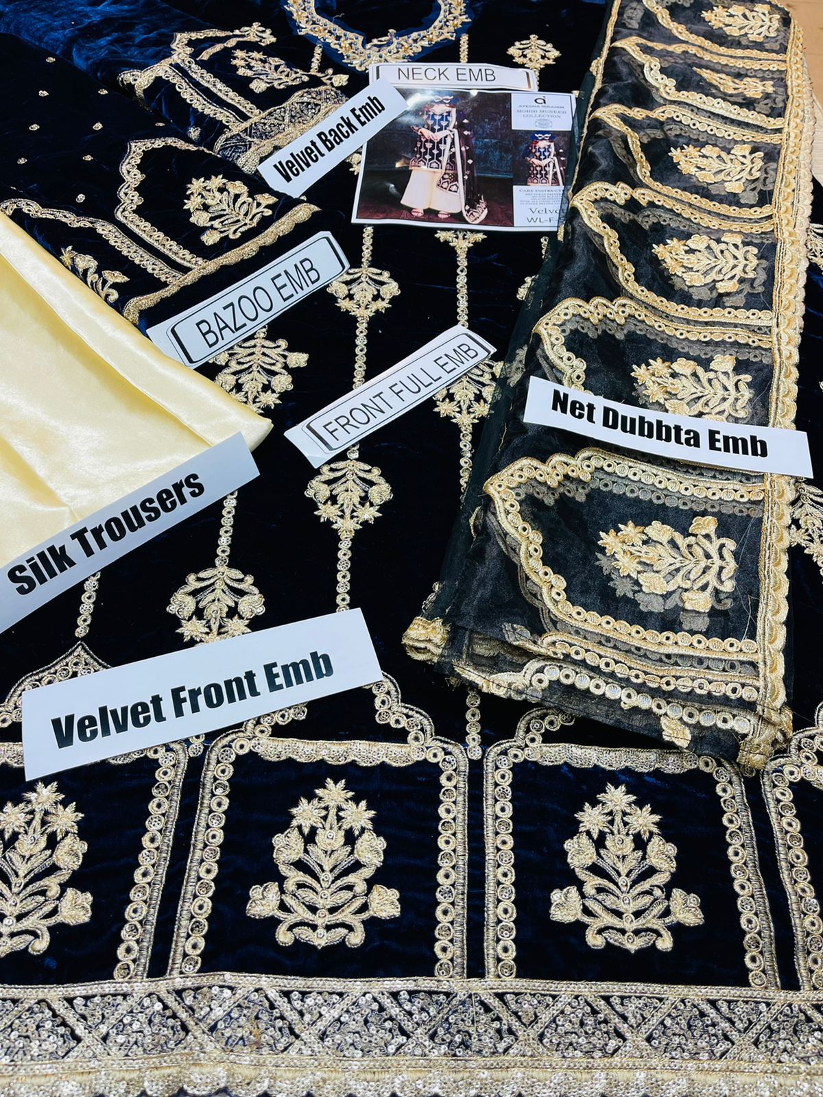 • LUXURY VELVET 3PCS WITH EMBROIDERY KOREAN NET DUPATTA AND SATIN SILK TROUSERS