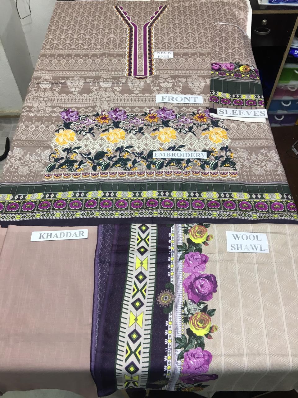 • Embroidered Khaddar Fabric Shirt and Trouser With Wool Shawl Dupatta Neck Heavy Embroidery Daman Heavy Embroidery ???? On Base Printed Back and Sleeves Soft Wool Printed Shawl