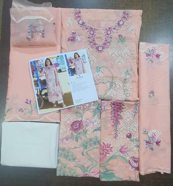 • Like a secret garden, delicate flora stretch out on the mesmerisingly soft pink canvas with hints of ivory, sage and berry peaking out in perfect harmony in ‘Lana’. Delicate schiffli embroidery of the shirt is laid out in fine threads creating a breathtaking composition. Paired with a light as air dupatta crafted from soft, Swiss voile with detailed embroidered borders, this design embodies sophistication and a timelessly captivating design sensibility.