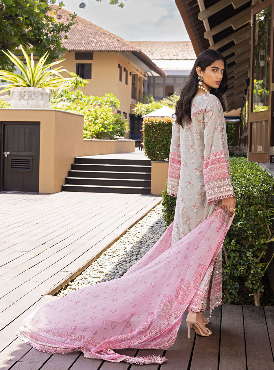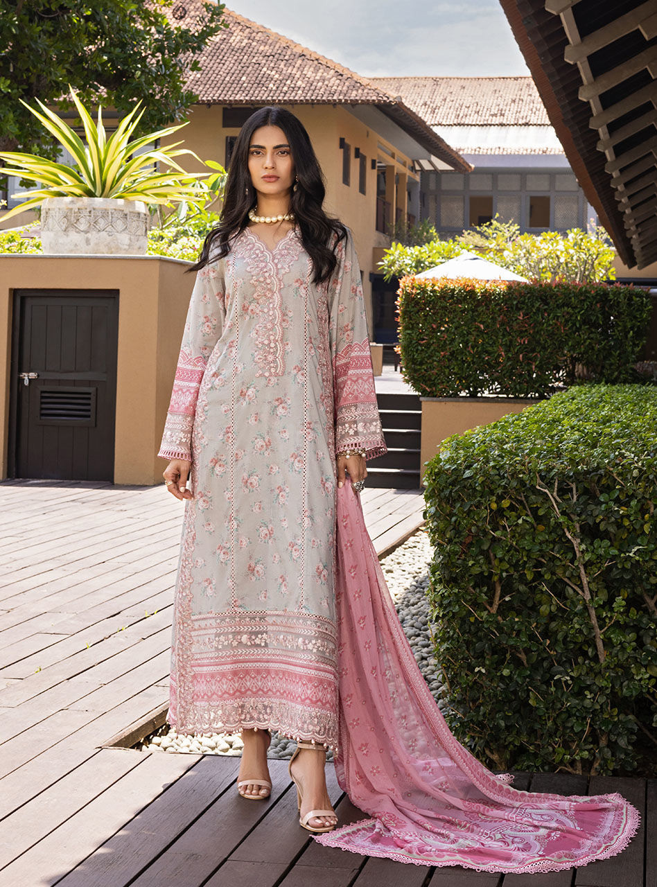 • Printed Shirt Fabric (3.2 meters) Printed Chiffon Dupatta (2.5 meters) Printed Pants Fabric (2.5 meters) Embroidered Neckline and Shirt Border (3.75 meters) Embroidered Daman and Sleeves Border (2 meters)
