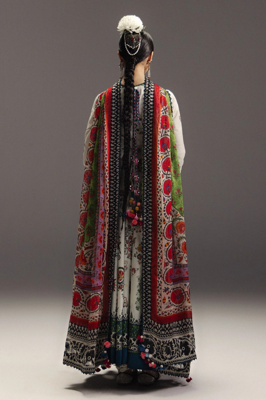 • Mehruba is a sophisticated Anarkali crafted on a deep off-white base, featuring composed suzani floral sprays and hand-painted style paisleys that create a harmonious and artistic palette. The silhouette is enhanced by a wide-set hemline border with a unique blue-denim accent paired with traditional black-and-white ethnic scrolls, providing depth and visual intrigue. Coordinated ivory trousers with minimal floral detailing at the hem maintain a clean and balanced aesthetic, while a high-contrast moss green silk dupatta, bordered with a regal suzani-patterned frame and monochromatic outer edge, completes the ensemble. Mehruba exudes artisanal craftsmanship, timeless elegance, and contemporary heritage sophistication, making it a statement Anarkali for discerning wardrobes.