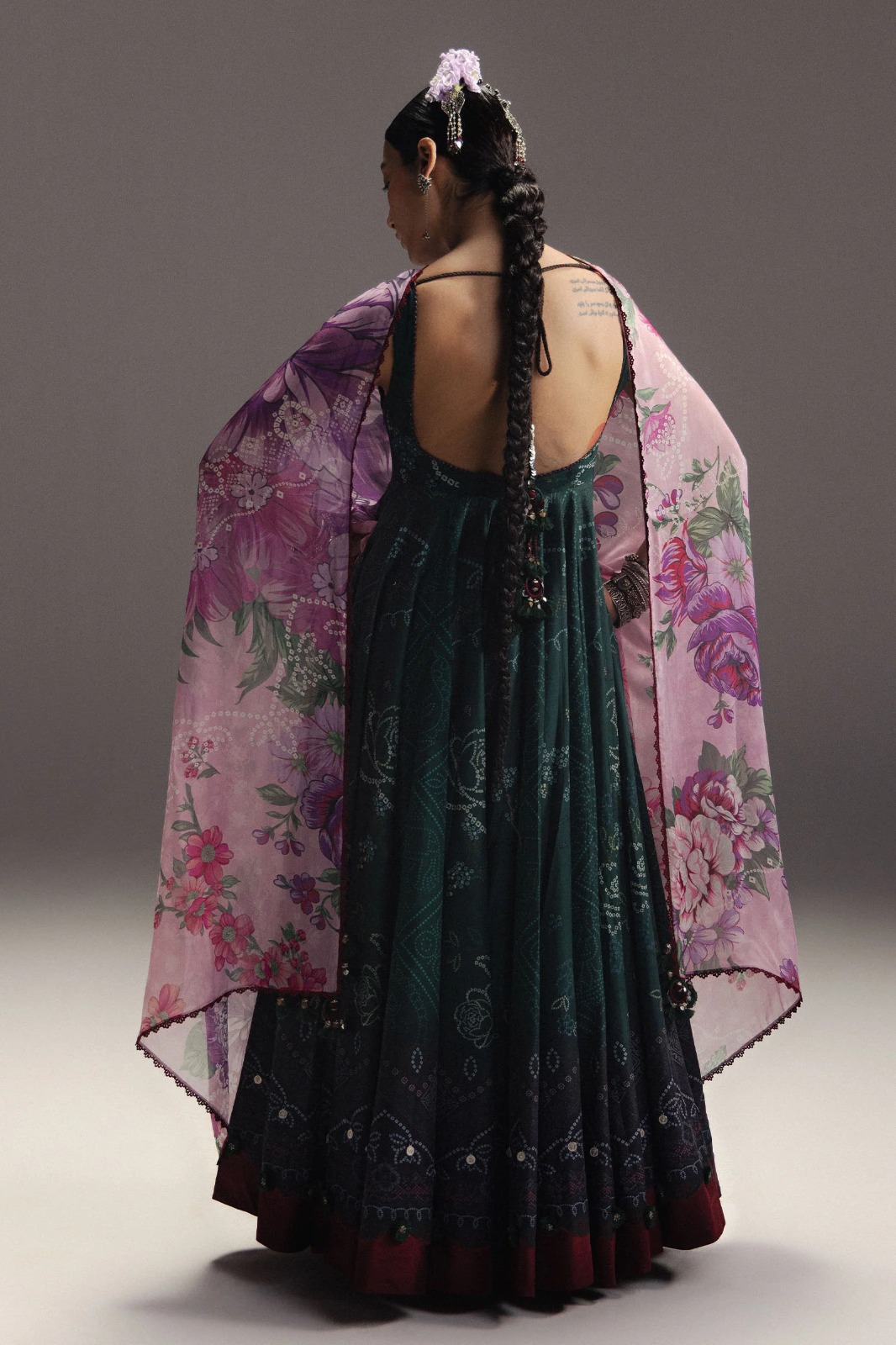 • Nayab is a regal Kalidaar Anarkali crafted in rich, saturated emerald green Pima lawn, offering a breathable yet luxurious finish. The design features chunari-inspired floral bunches and delicate vertical patterns that create fluid movement across the fourteen-panel silhouette. Composed ivory floral clusters and subtle hints of blossom pink add dimension and refinement to the jewel-toned base, creating a sophisticated harmony of color. The digitally printed cambric trousers echo traditional tie-dye artistry with a coordinated chunari-inspired spray, while the silk dupatta is accented with soft powder-pink floral bunches for a multi-dimensional, graceful finish. A refined interplay of jewel green, ivory, and blush pink, Nayab embodies heritage richness with timeless elegance.